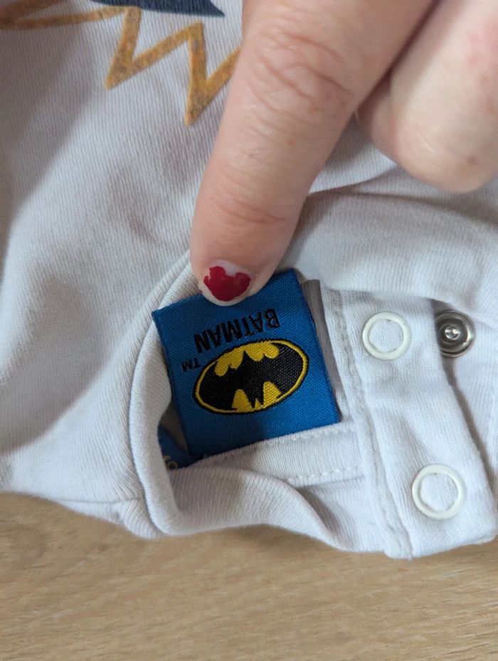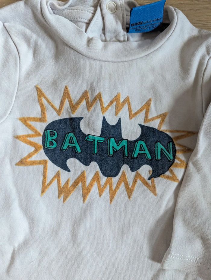 Petit t-shirt manches longues 9 mois. Batman. En bon état. Petite tâche voir la dernière photo. Maison non fumeur et sans animaux. #9moisgarconnonostory