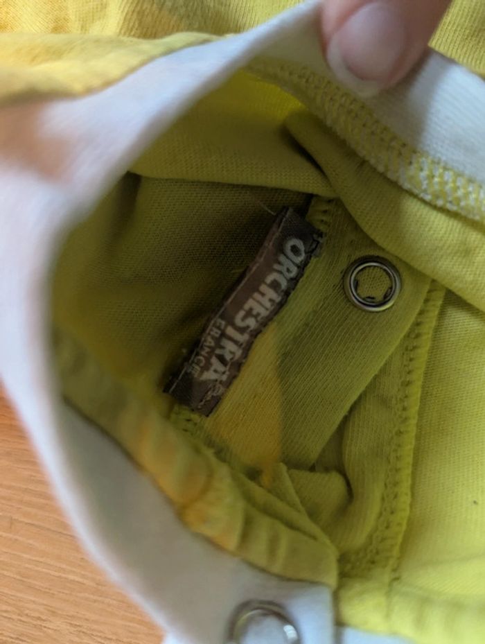 Petit t-shirt Vert/Jaune Orchestra. En taille 3 mois. Ouverture et fermeture dans le dos. En bon état à été porté régulièrement. Maison non fumeur et sans animaux #3moisgarconnonostory