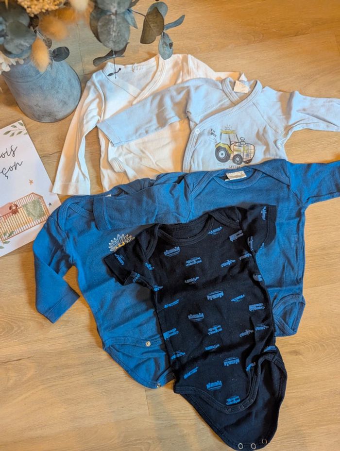 Super Lot : 1 bodie manche courte. 3 bodies manches longues dont un avec ouverture cache cœur. Le bodie blanc est offert car légèrement agrandit et déchiré aux pressions en bas. Ils ont été portés mais restent largement en bon état. Maison non fumeur et sans animaux. #3moisgarconnonostory