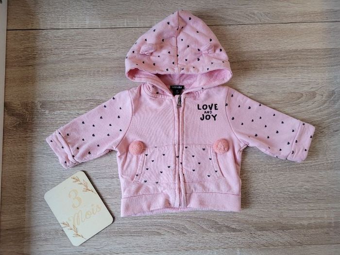 Sweat zippé à capuche Couleur : Rose - Inscription "Love and Joy" - Pompon Marque : Kiabi Taille : 3 mois - 56-62 cm - 6kg