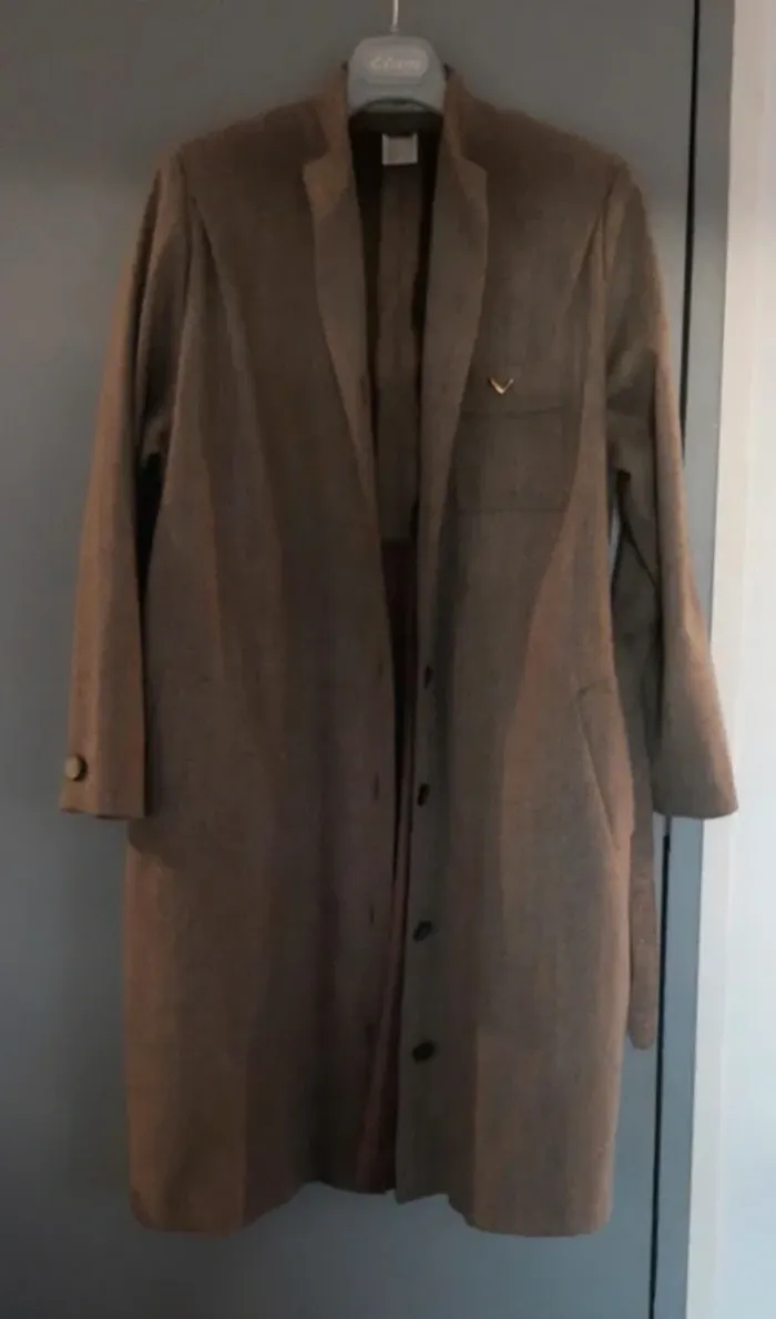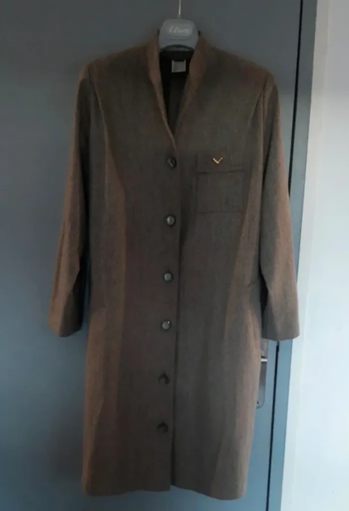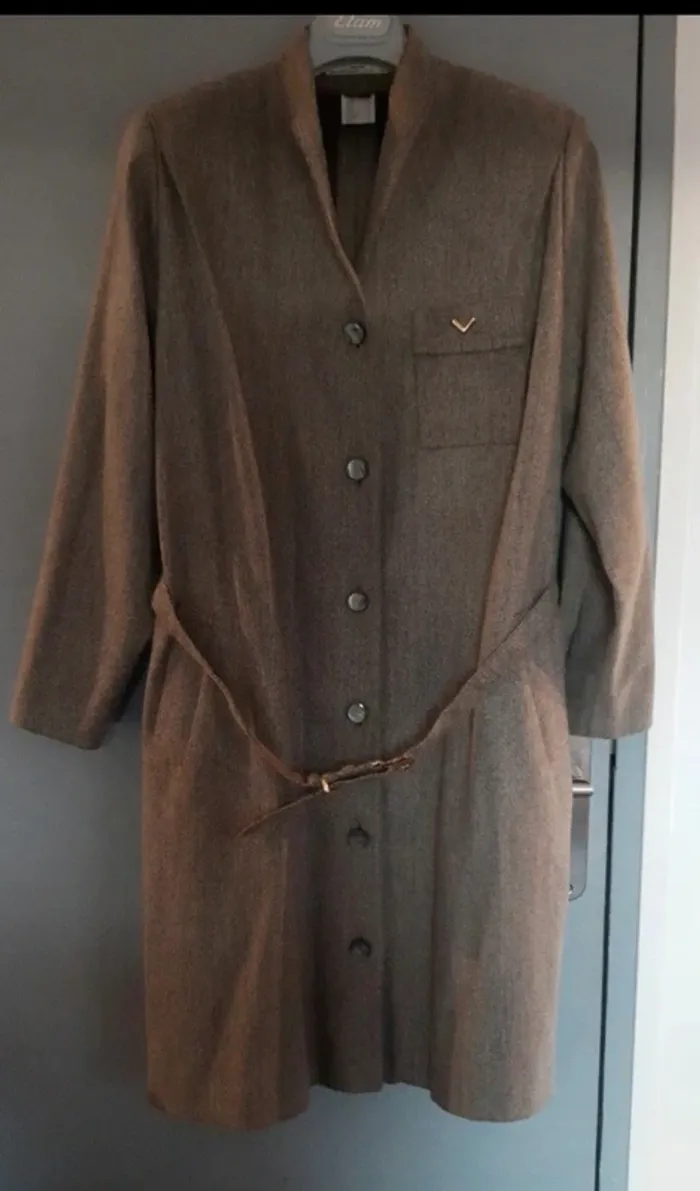 Élégant manteau long vintage, confection artisanale par une couturière (B. Bernard Roselyne – Vichy). Modèle unique, coupe droite avec épaulettes et fermeture à boutons. Coloris marron/gris chiné très chic, avec petite broche dorée sur la poche poitrine. Doublure intérieure satinée marron. 📏 Mesures (à plat) : Épaules : 37,5 cm (avec épaulettes) Aisselles : 54 cm Longueur totale : 100 cm Manches : 56 cm ✨ Taille conseillée : 42/44 (se reporter aux mesures). 🧵 Composition mixte (voir étiquette), tissu épais type laine/polyester, parfait pour l’automne et l’hiver. Très belle pièce vintage et rare. #vanessavadfemme42 #vanessavadfemme44 #mantauvintage #manteaufaitmain #vintagefemme #modevintage #manteau4244 #coutureartisanale