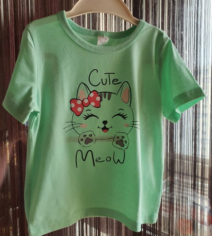 T-shirt enfant vert imprimé d'un chat mignon avec un nœud rouge. - Type de produit : T-shirt - Marque : Kiabi - Taille : 5 ans / 110 cm - Couleur : Vert imprimé - Caractéristiques : Imprimé chat avec nœud rouge N'hésitez pas à me contacter pour plus d'informations ou de photos.