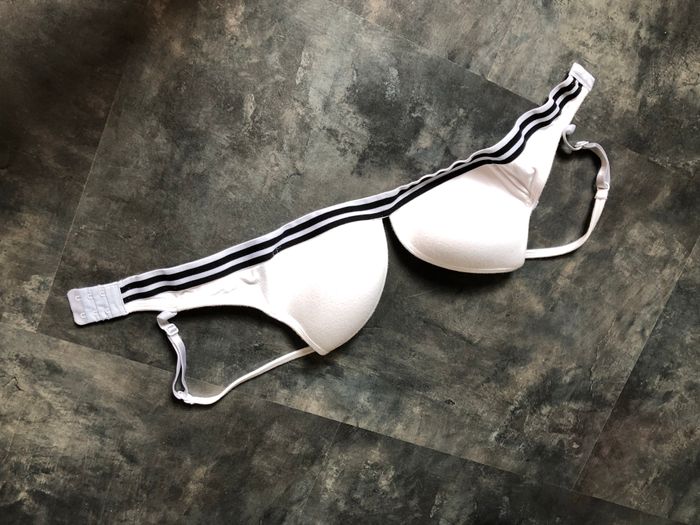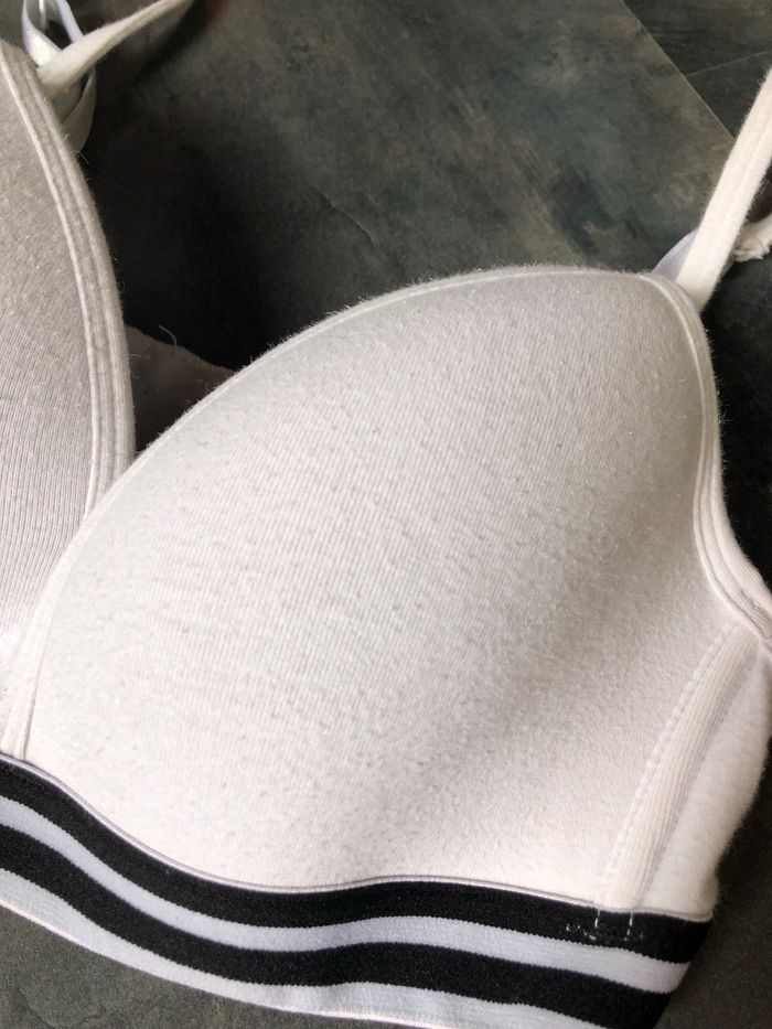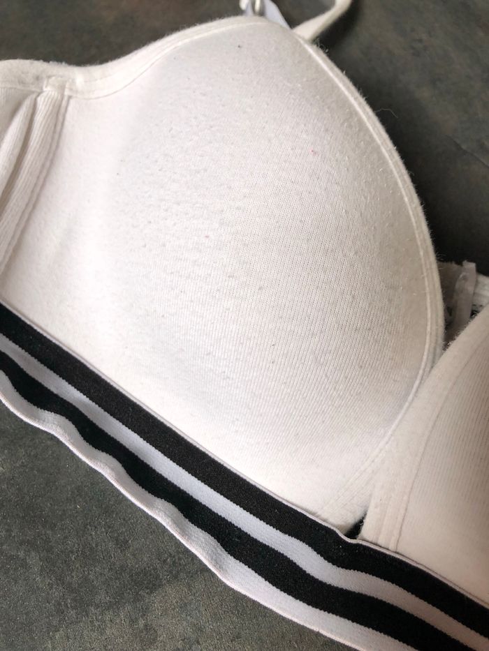 Soutien gorge coton blanc ( bouloches) Large élastique rayée noir et blanc style sportwear Taille 90B Coques fines , peu rembourrées la halle