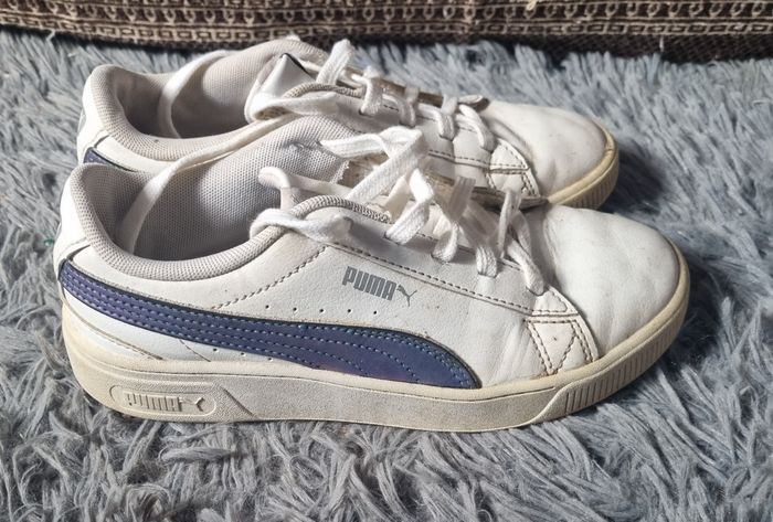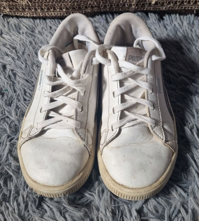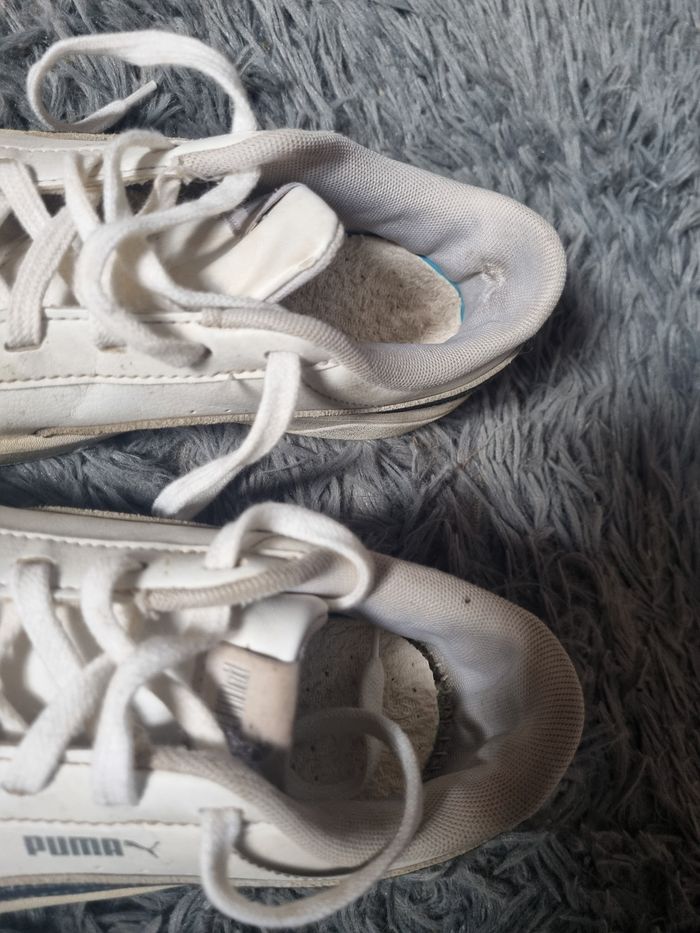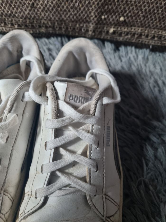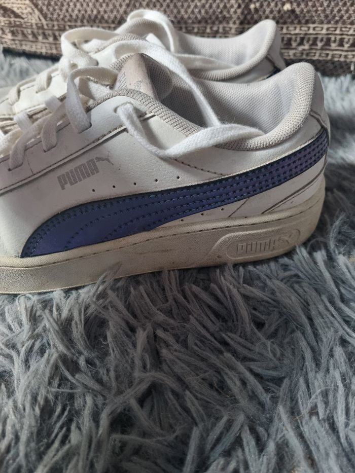 Basket basse blanche et bleu,marque Puma pointure 34,à lacets, (la semelle intérieure n'est plus celle d'origine),très bonne état peut être juste besoin d'un lavage.