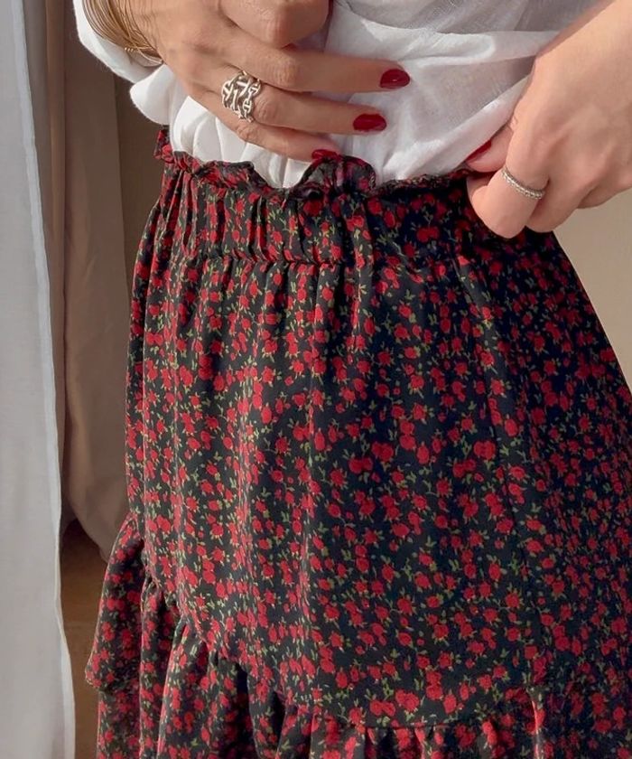 Jupe à volants Couleurs : noir, rouge et vert Détails : volants, ceinture élastique et doublée Motif : fleuri Taille : 36 Marque : Ikoone & Bianka Parfait état - très peu portée #jupe #jupefleurie #jupeàvolants #jupeikooneetbianka #ikooneetbianka #jupe36