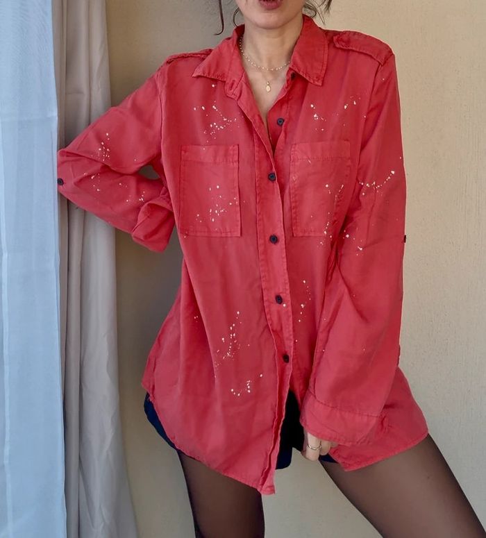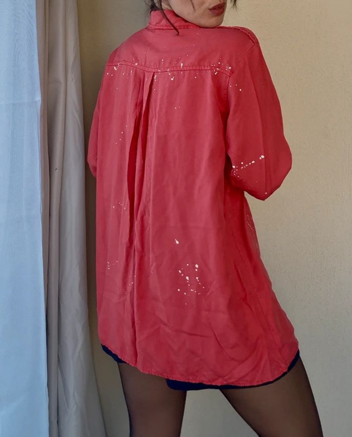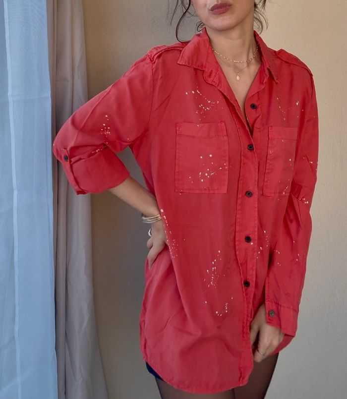 chemise coupe droite Matière : lyocell Couleur : rouge Motif : éclats de peinture blanche taille unique made in Italy Légère et agréable à porter Les manches se portent longues ou 3/4 (cf photo 2) Très bon état #chemiserouge #chemisey2k #chemisecoupedroite #madeinitaly #chemisemadeinitaly #chemiserougemadeinitaly