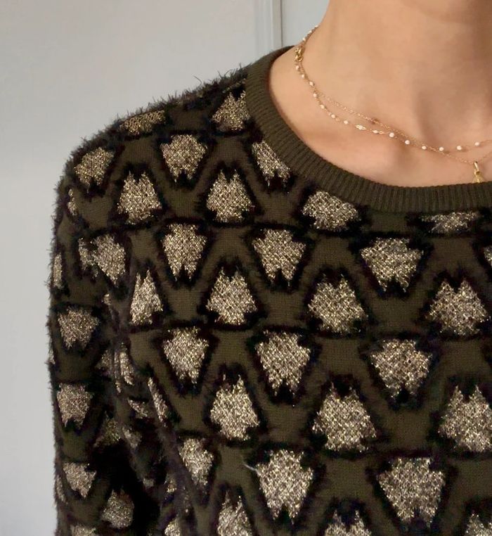 Pull over chaud Motifs : géométriques Couleur : vert kaki , noir et doré Taille 16 ans ~ équivalent 36 Parfait état Beau, chaud et confortable #pull #pullover #pull16ans #pullvertkakietdore #pull36 #chipie #pullchipie #pulldhiver #pullconfortable #pullchaud