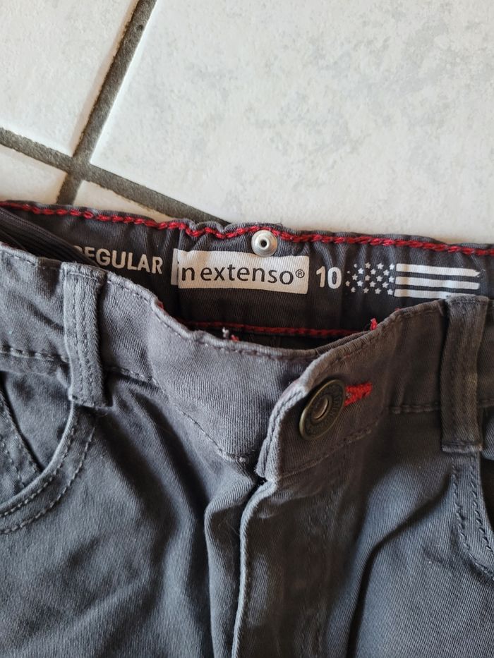 Taille 10 ans Le lot comprend : - 1 marron camel TAO 98% coton 2% élasthanne Taille ajustable Très bon état - 1 gris clair regular In Extenso 100% coton Taille ajustable Très bon état - 1 bleu foncé regular In Extenso 100% coton Taille ajustable Porté, légèrement blanchi aux genoux Reste en très bon état - 1 gris anthracite et rouge regular In Extenso 98% coton 2% élasthanne Taille ajustable Très bon état