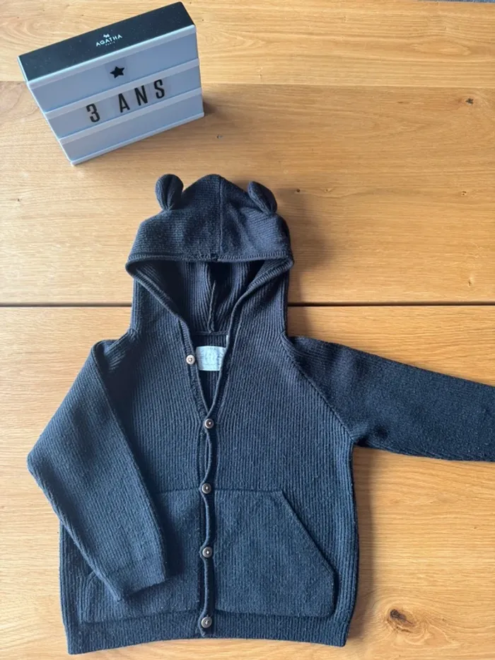 Gilet à capuche à manches longues gris anthracite de marque Zara. Taille 3 Ans (98cm) Il est tout doux avec des oreilles en relief au niveau de la capuche. 2 poches à l’avant et boutons en bois. Légères bouloches à cause de la matière (cf voir photos) donc classé en bon état. Super pratique c’est un indispensable 🩶. 🛍️ N'hésitez pas à jeter un œil à mon dressing et composer votre lot de nombreux autres articles vous y attendent en fille 3/4 Ans. #fille3ans_lapetitemarie #fille4ans_lapetitemarie #lapetitemarie