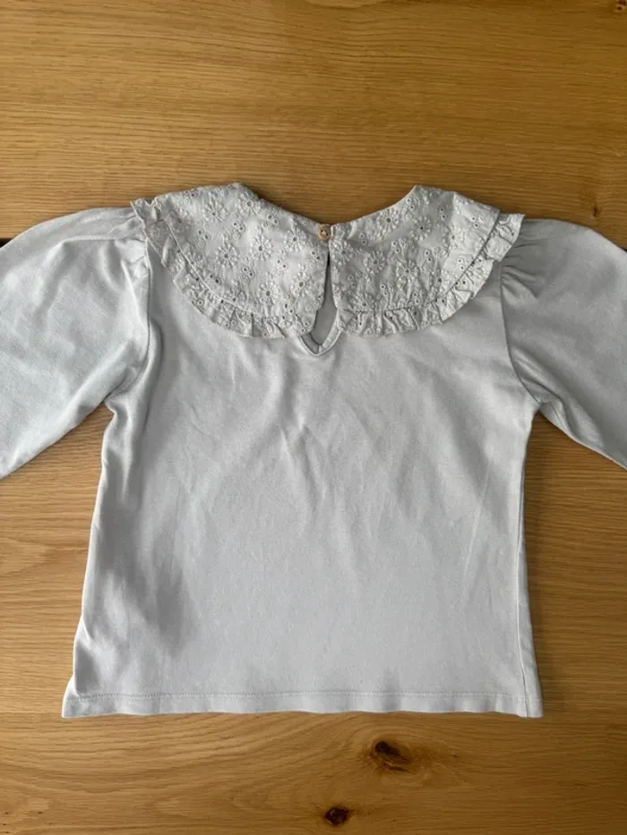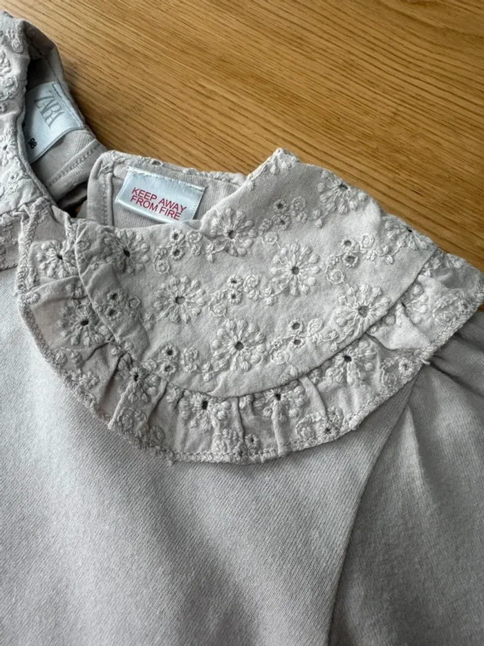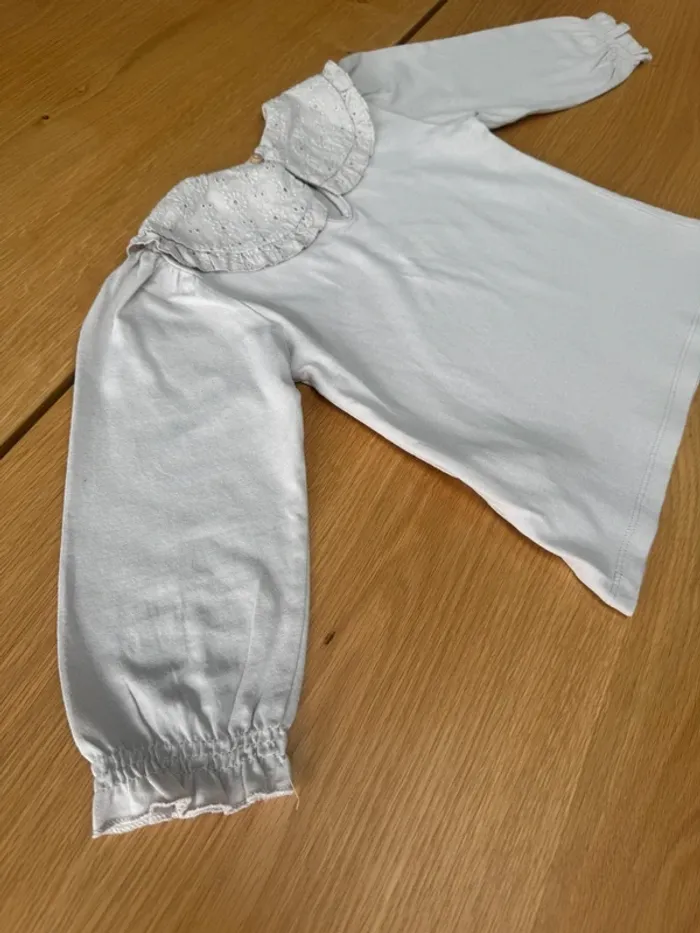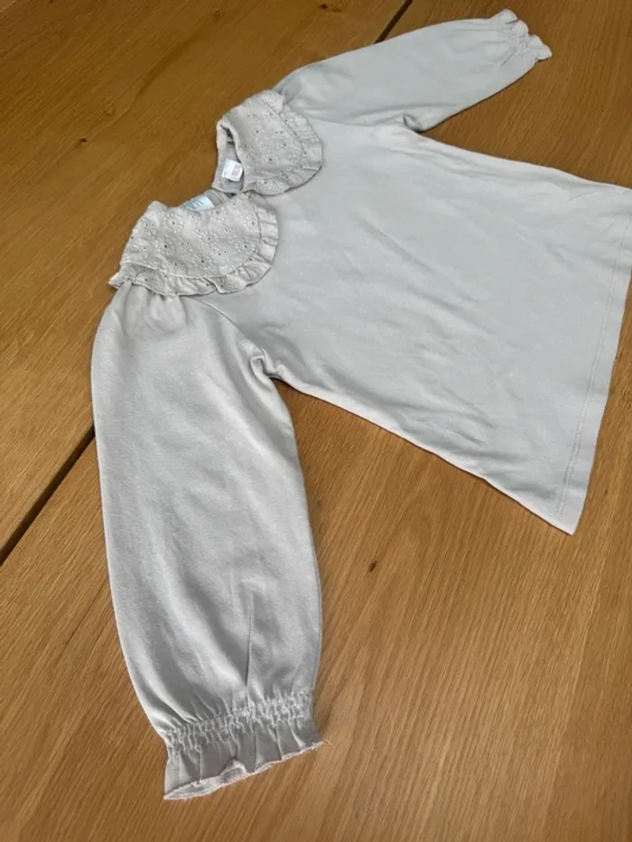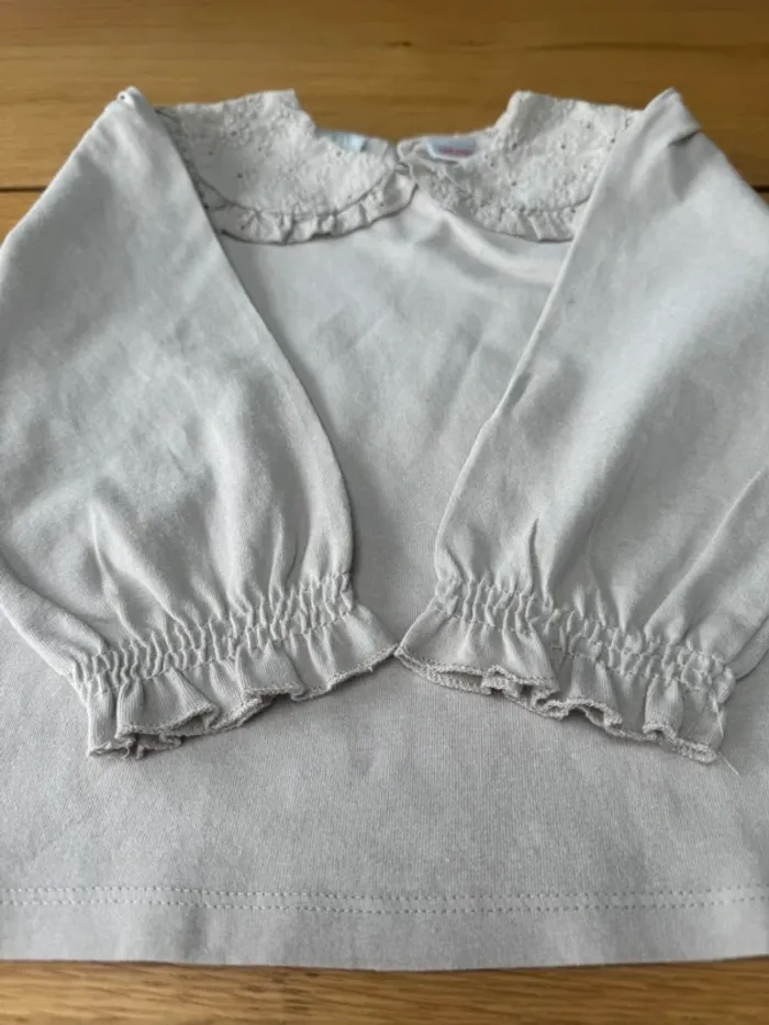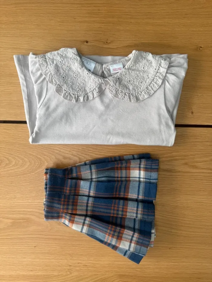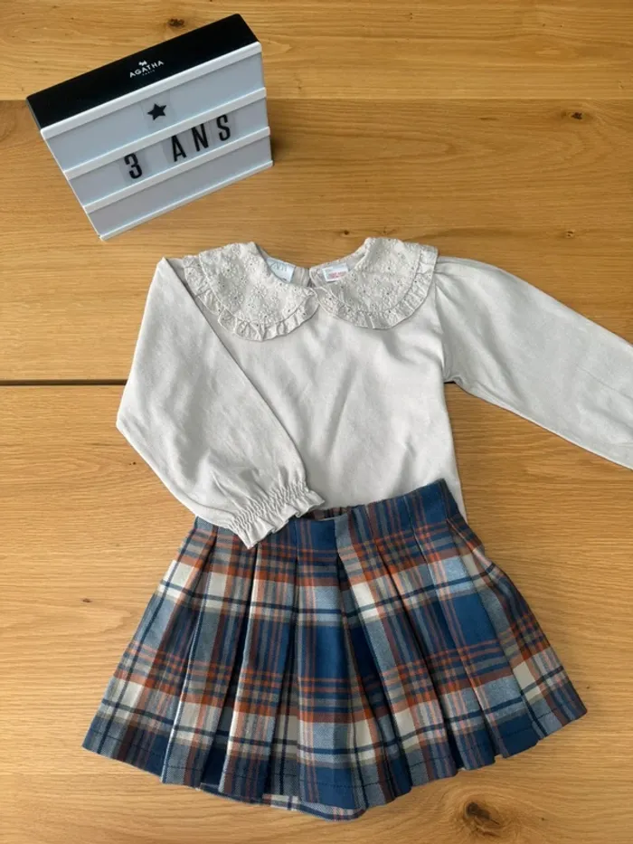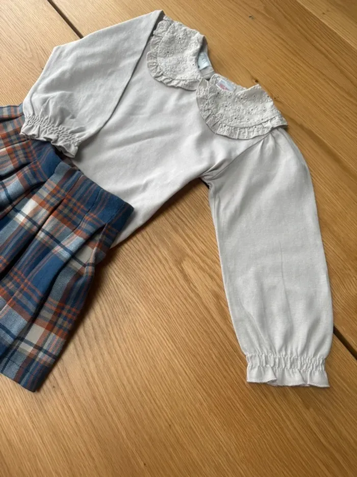 Tenue 2 pièces composée de : - un teeshirt manches longues, avec col Claudine dentelle. Couleur gris/beige comme les rayures de la jupe short. Manches larges et resserrées au niveau du poignet. Un bouton en bois dans le dos, il est en 100% coton. - un jupe-short en tartan écossais tons de bleu/marron/gris avec ceinture élastique à la taille. Plis à l’avant pour donner l’effet jupe. Taille 92cm mais porté par ma fille en même temps que le 98cm du haut. Tout est de marque Zara et en excellent état. 🤎 💙 🛍️ N'hésitez pas à jeter un œil à mon dressing et composer votre lot de nombreux autres articles vous y attendent en fille 2/3 ans. 🎉 #bebefille24mois_lapetitemarie #fille3ans_lapetitemarie #lapetitemarie