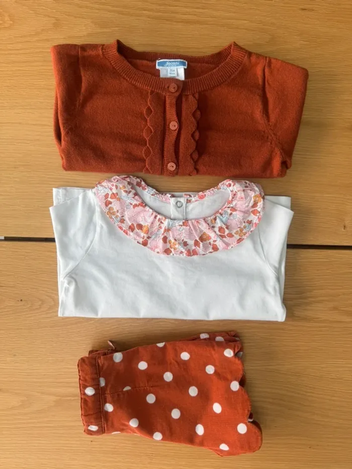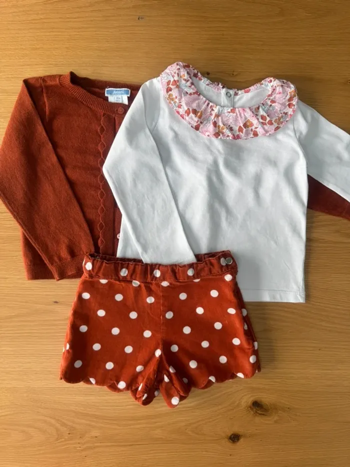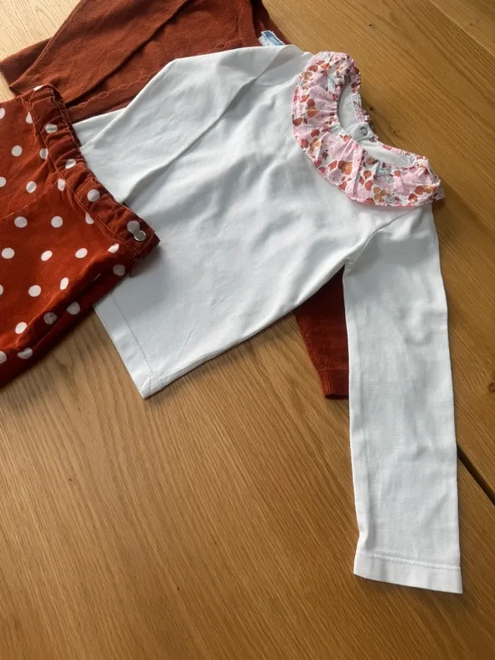 Superbe ensemble liberty écureuil qui se compose comme suit : - teeshirt manches longues blanc avec col froufrous liberty Betsy écureuil. Tons de rose/marron 🌸 🤎. Boutons pressions dans le dos. Taille 3 Ans - gilet assorti marron avec rebord froufrous au niveau des boutons. 21% de laine. Il est tout doux. Taille 36 Mois. - short également de la même collection en velours marron et pois blanc. Réglable à la taille et rebords festonnés. Taille 18 mois indiquée mais taille immense et convient parfaitement pour du 3 Ans. Tout est de marque Jacadi et en excellent état. 🤎 🩷 🛍️ N'hésitez pas à jeter un œil à mon dressing et composer votre lot de nombreux autres articles vous y attendent en fille 2/3 ans. 🎉 #bebefille24mois_lapetitemarie #fille3ans_lapetitemarie #lapetitemarie