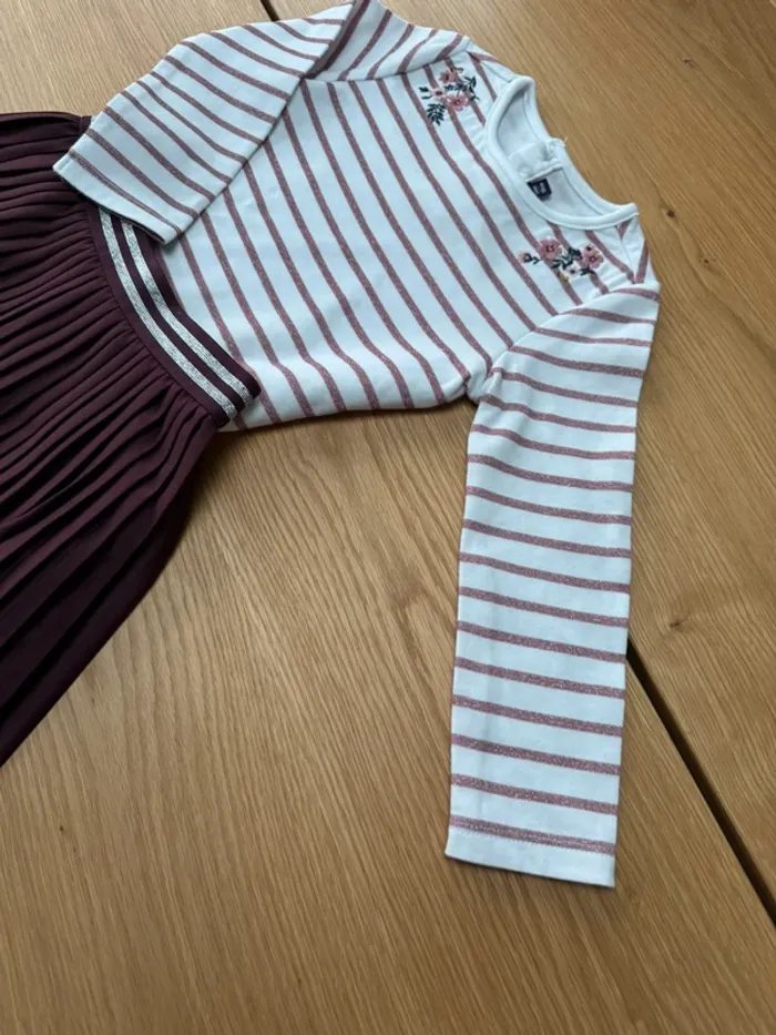 Tenue 2 pièces, jupe plissée bordeaux et marinière blanche/rose irisé - Taille 3 Ans - photo numéro 2