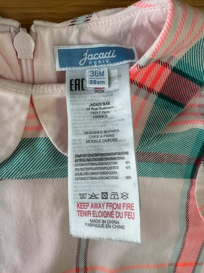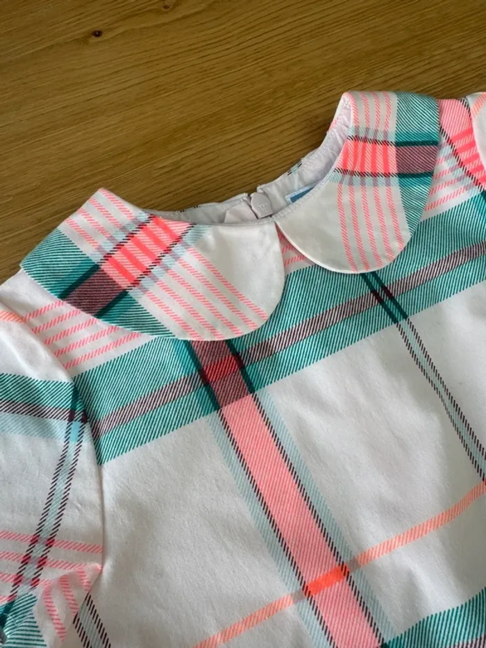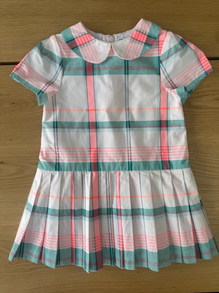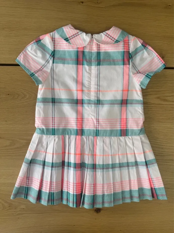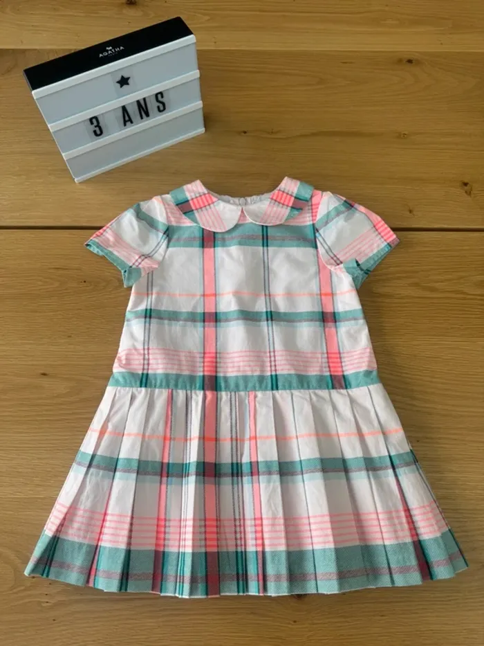 Robe à manches courtes en tartan de marque Jacadi. Taille 36 Mois/ 3 Ans Coupe ajustée à la taille, avec joli plissage et col Claudine. Tons de rose pâle, fluo et vert cœur. Elle est doublée et avec une fermeture éclair dans le dos. État neuf elle a été protée une seule fois (malheureusement 🙈) 🩷 💚. 🛍️ N'hésitez pas à jeter un œil à mon dressing et composer votre lot de nombreux autres articles vous y attendent en fille 3/4 ans. 🎉 #fille3ans_lapetitemarie #fille4ans_lapetitemarie #lapetitemarie