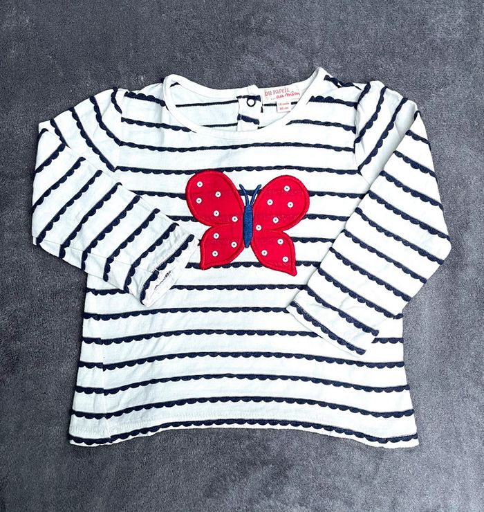 vends ce joli teeshirt à manches longues pour bébé fille, En excellent état, peu porté. Motif papillon Boutons pression au col pour faciliter le passage de la tête. Marque : okaidi Taille : 18 mois Achetez en lot dans mon dressing pour activer la réduction automatique et rentabiliser vos frais de port 😉