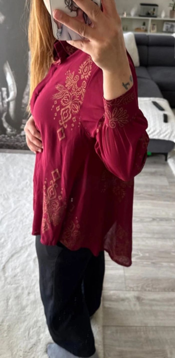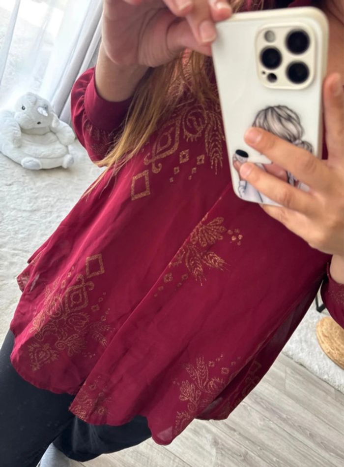 👚Magnifique chemisier transparent avec ses motifs dorée - jamais porté neuf sans étiquette - New collection- taille unique Le dos est plus long Taille aisselles à aisselles : environ 54 cm Longueur 63 cm #modefemme #chemisierfemme #soleil #leger