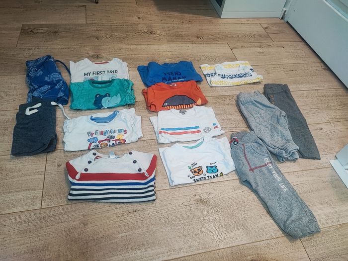 3 pantalons 4 t shirts manches longues 1 t shirt sans manches 3 t shirt manches courtes 2 short 1 pull Taille 12 mois Tres bon état