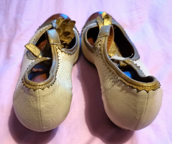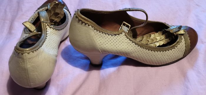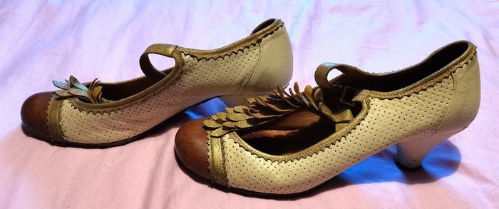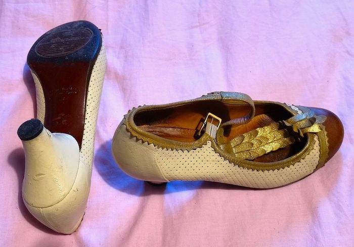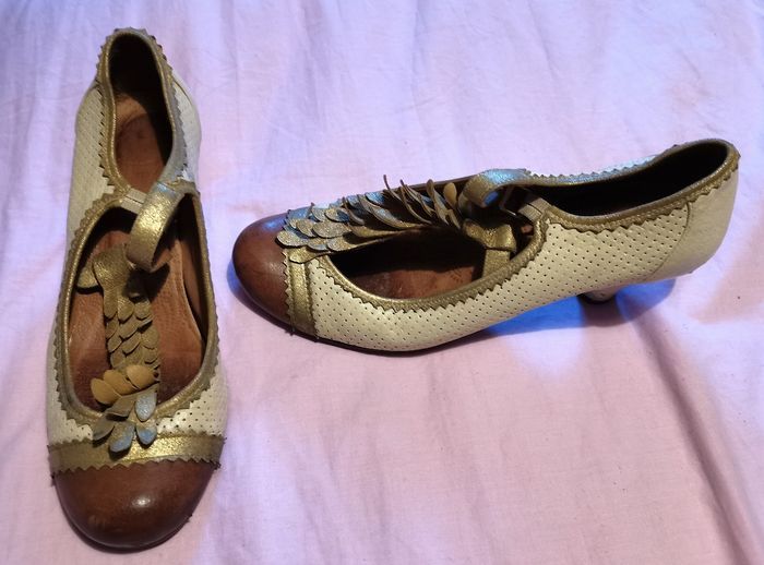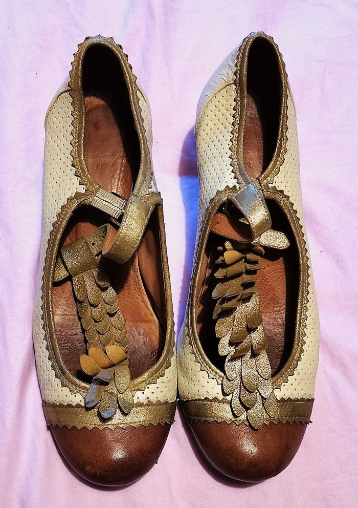 Escarpins "Chie Mihara", en cuir couleur champagne, doré et bouts couleur caramel, details déco devant couleur doré, hauteur du talon 6 cm, pointure 36, tbé.