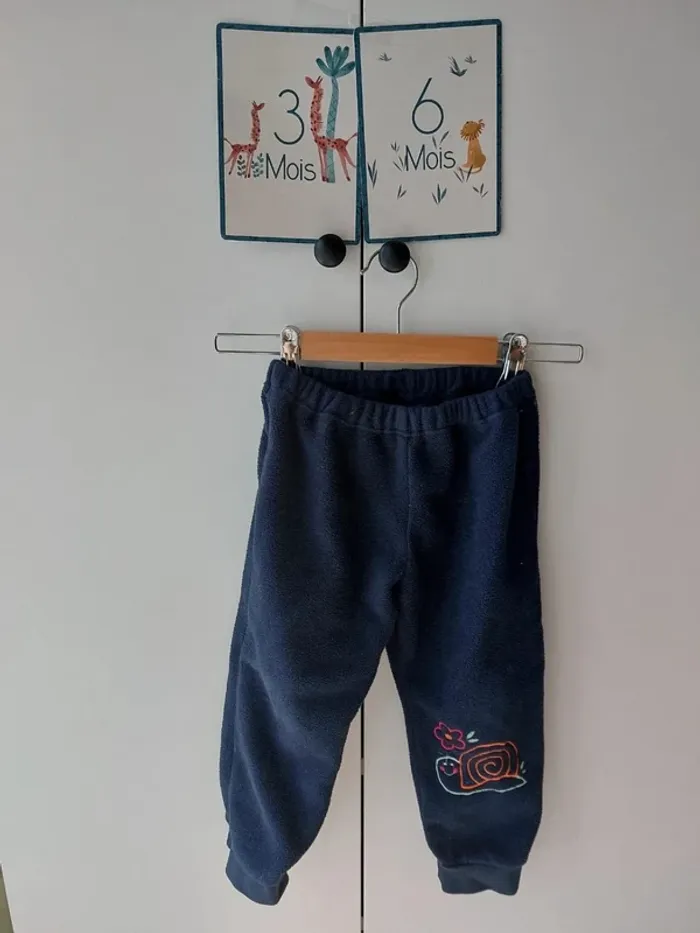 Fait par ma maman pour mon fils En très bon état Motif escargot brodé en bas de jambe Taille elastiquée et bas de jambe resserré Matière douce et bien chaude Modèle mixte Longueur à partir de l'entrejambe : 34 cm #mooneygarçon36mois