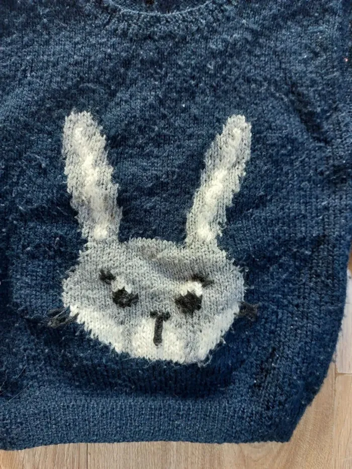 Pull en laine bleu marine avec motif lapin Fait par ma maman pour mon fils Ouverture par des boutons au dos Bon état (un peu bouloché comme visible sur photo) #mooneygarçon24mois