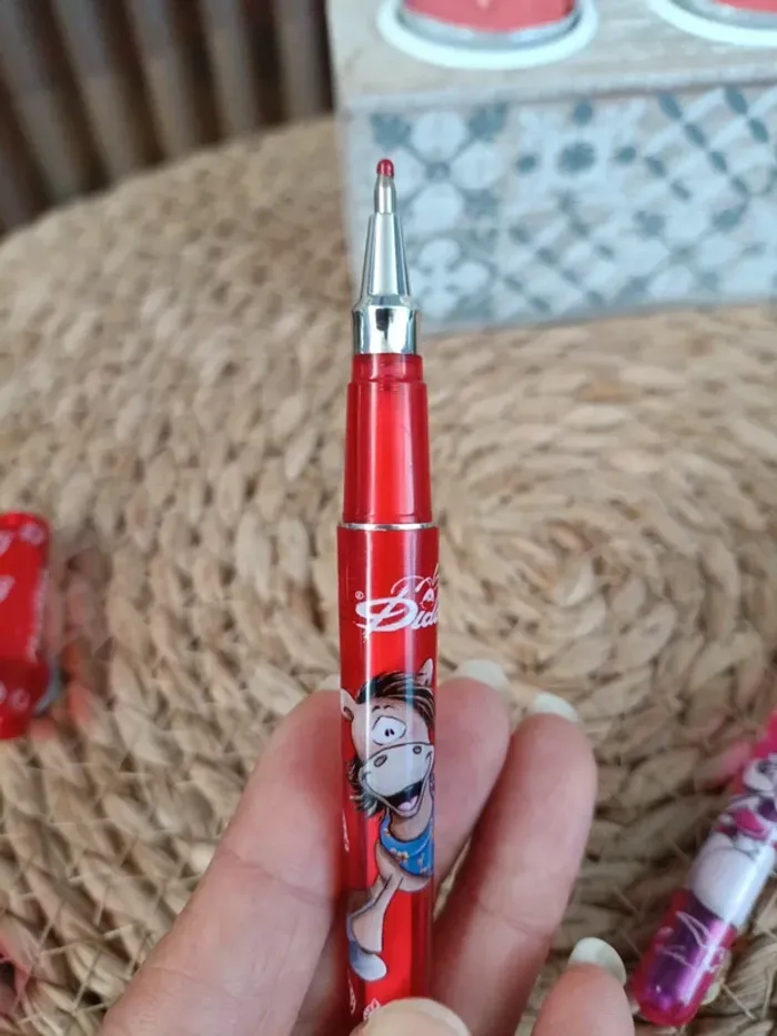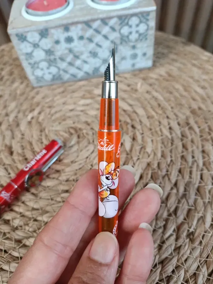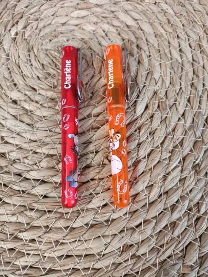 prénom Charlène: 🌹Un stylo-plume rouge jamais utilisé avec une recharge. 🍊Un stylo bille orange jamais utilisé la bille est encore en place. Les stylos sont fonctionnels les encres sont de couleur bleu pour stylo plume noir pour le stylo bille. Pour plus de renseignements n'hésitez pas 😉
