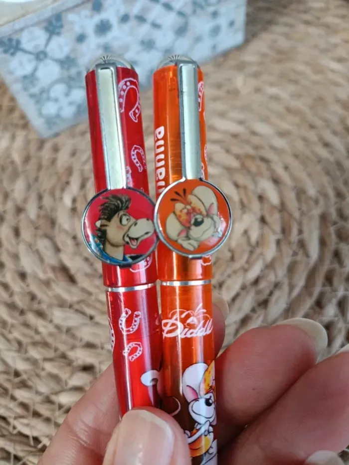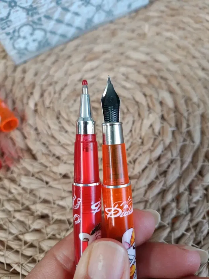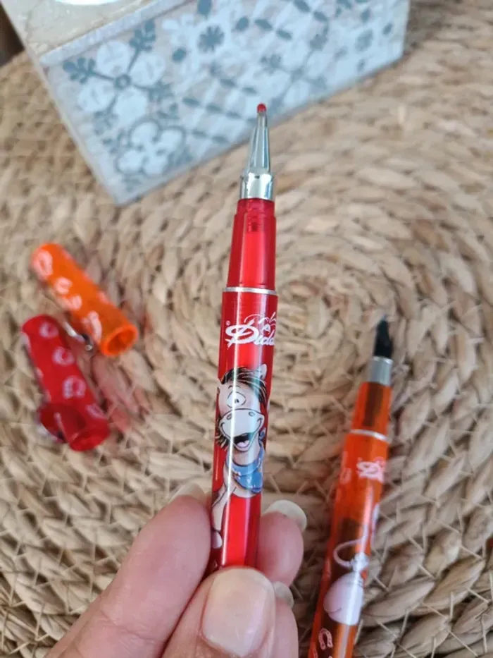 prénom Johanne: 🍊Un stylo-plume orange jamais utilisé avec une recharge. 🌹Un stylo bille rouge jamais utilisé la bille est encore en place. Les stylos sont fonctionnels les encres sont de couleur bleu pour stylo plume noir pour le stylo bille. Pour plus de renseignements n'hésitez pas 😉