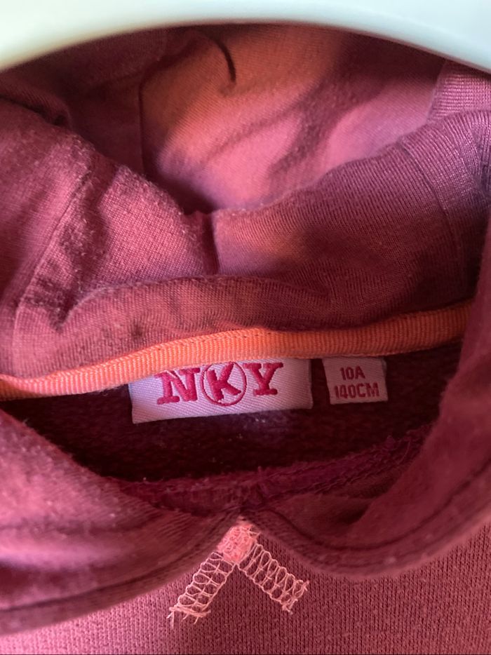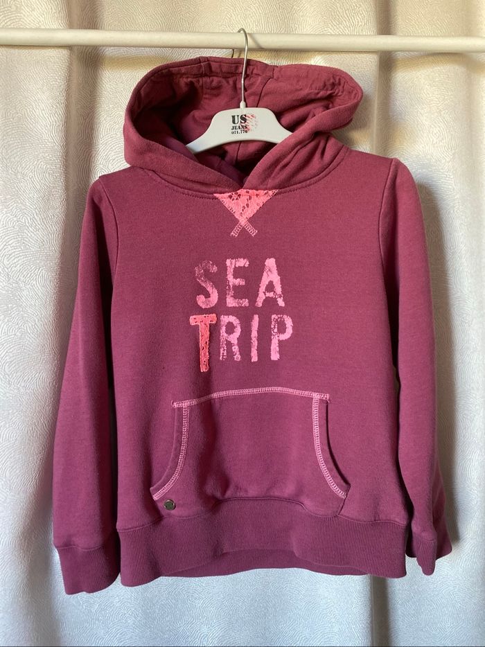 Pull sweat à capuche vieux rose Poche kangourou 🦘 Plaque ancre ⚓️ Empiècement dentelle rose corail à l'encolure Taille 10 ans 140 cm Kiabi NKY Bon état car fines bouloches