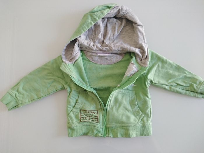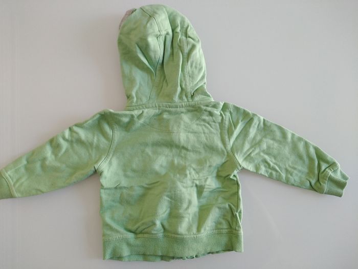 Gilet à capuche, zippé, deux poches avant Marque POMMETTE Couleur vert menthe clair Taille 12 mois Très bon état