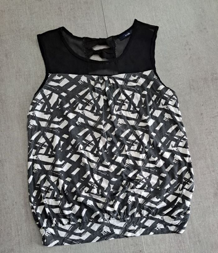 Blouse sans manche Effet bouffant resserrer à la taille Noir et blanc Taille 38 État correcte, blanc un peu moins blanc que d'origine mais pas non plus grisonnant et quelques bouloches