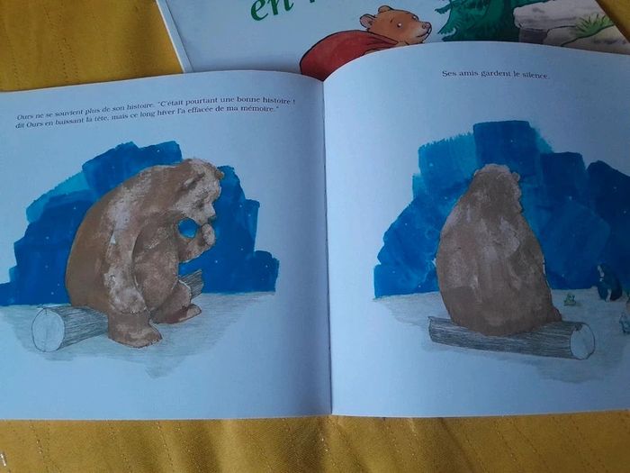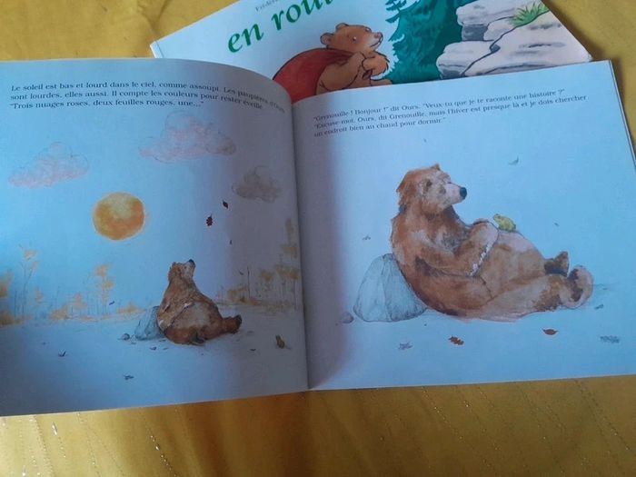 🎀Idéal Cadeau 🎁 de Noël 🤶🎄🎅 🎀🎄 🎅 🎄 🤶 Lot de 2 livres sur le thème des Ours > du voyage et de la solitude. En route Petite ourse a grandi. C’est le grand jour : à son tour de quitter la grotte paternelle. Quel bonheur ! Vite, en route ! À l’aventure ! Mais Papa ours, lui, est songeur. Après lui avoir préparé un baluchon bien garni, il la met en garde : « Sois prudente, petite ourse, le monde est plein de surprises ! » Petite ourse écoute à peine. Pourtant, elle va bientôt faire une drôle de rencontre et elle sera bien contente que Papa ours ait pensé à tout en remplissant son baluchon… Encore vendu 12.50€ #apprentissagedel'autonomie #entraide, solidarité #montagne #ours Ours a une histoire à raconter Avant d’entrer en hibernation, Ours a une histoire à raconter, mais ses amis sont trop occupés pour l’écouter. Malheureusement, le long hiver efface l’histoire de sa mémoire et, au printemps, Ours n’a plus rien à raconter. Oh, si ! lui soufflent ses amis, justement, la vie est un éternel recommencement… Encore vendu 12.50€ #amitié #canard, oie #générosité #grenouille, crapaud, têtard #hibernation #ours #souris, mulot, rat, campagnol #taupe #saisons