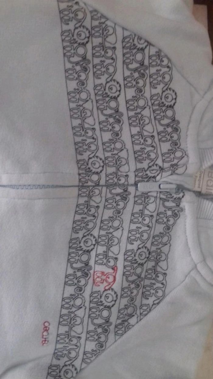 Vend. Excellent état. Comme neuf 6 mois obaibi Bleu ciel Tous les animaux en bleu marine. Petit chien rouge. Sur la poitrine.