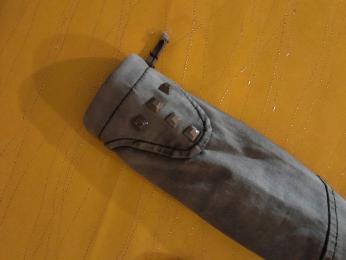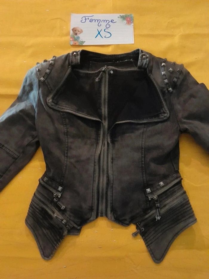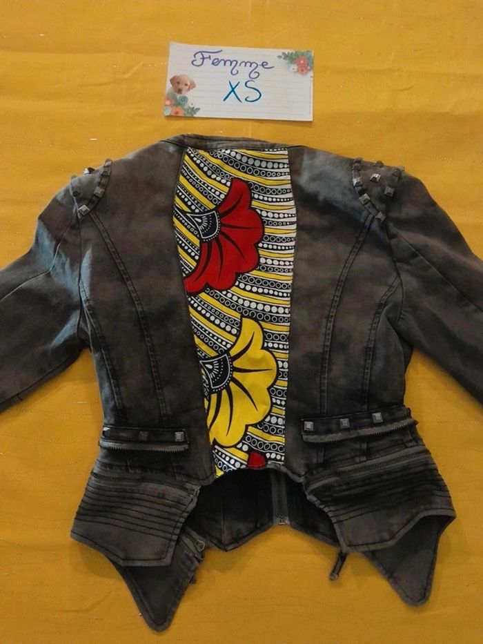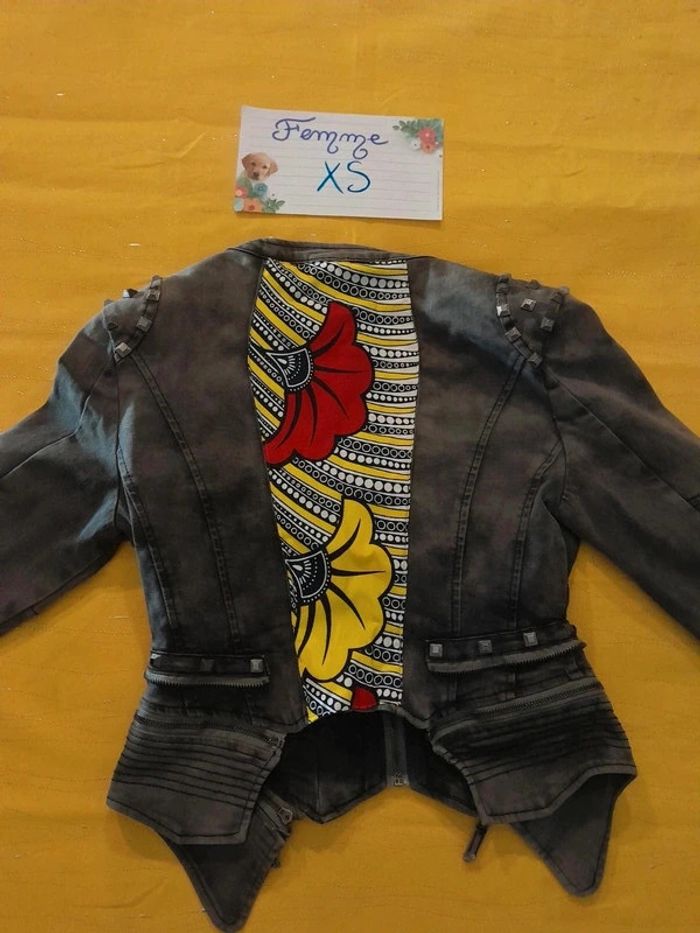 Veste cousue main Veste en jean gris Taille XS avec empiècement de tissu africain tricolor = blanc jaune rouge Faits mains = empiècement cousu à la main ! #vesteafricaine #vesteavecafrique #vestefaitmains #vesteaclous #vestejeanrisXs #vestexsgrise #vestejeangris #grisveste #vestegrisecloutée