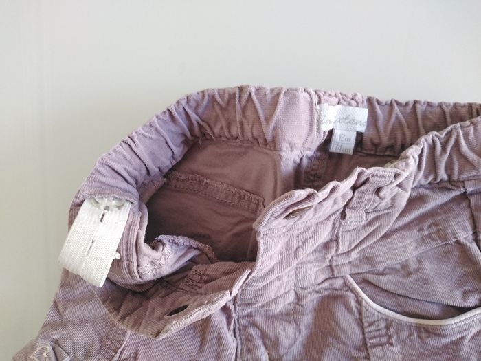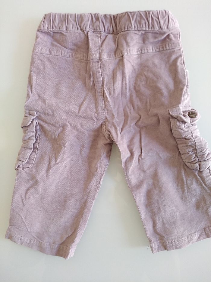 Pantalon couleur lila, effet velours côtelé, taille élastique ajustable, bouton pression devant, 2poches de chaque côté Taille 12 mois, 74 cm Marque IN EXTENSO Très bon état