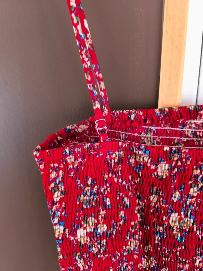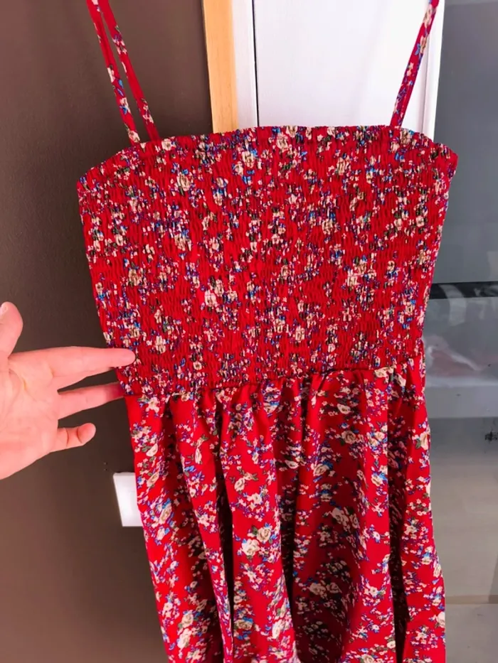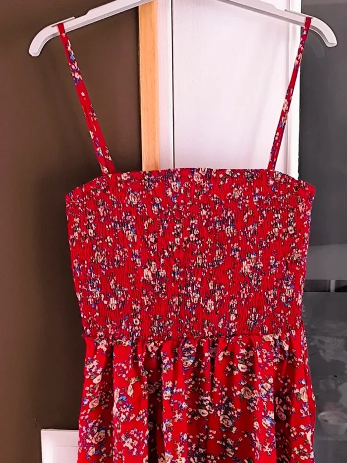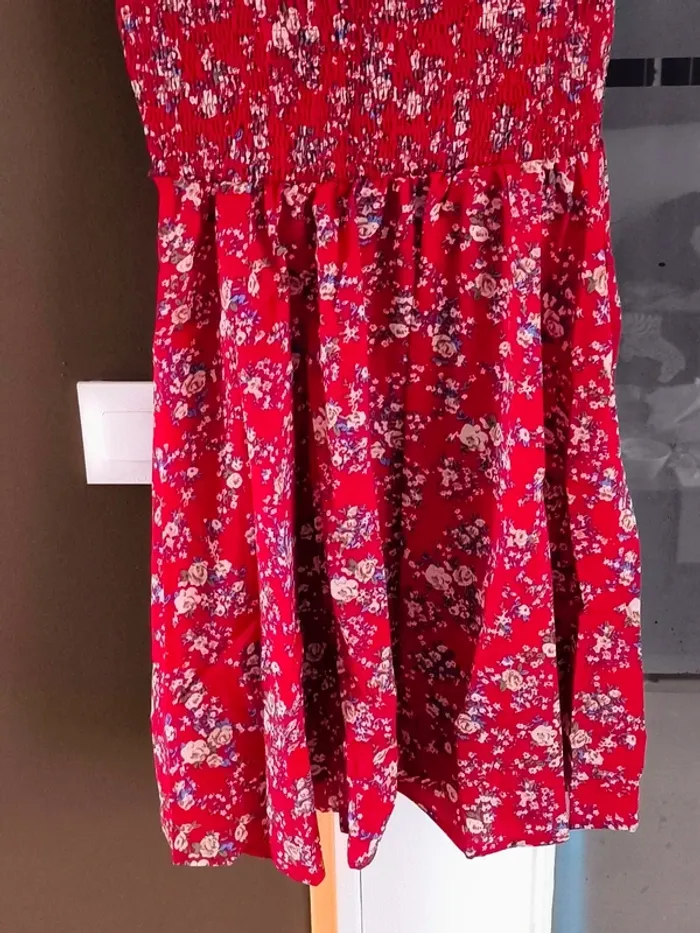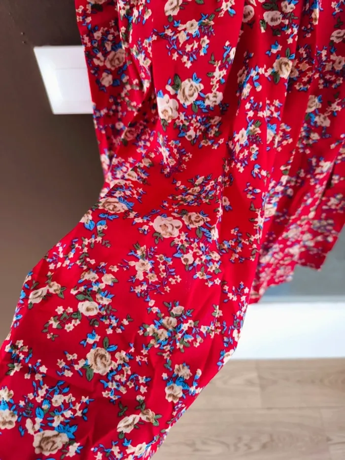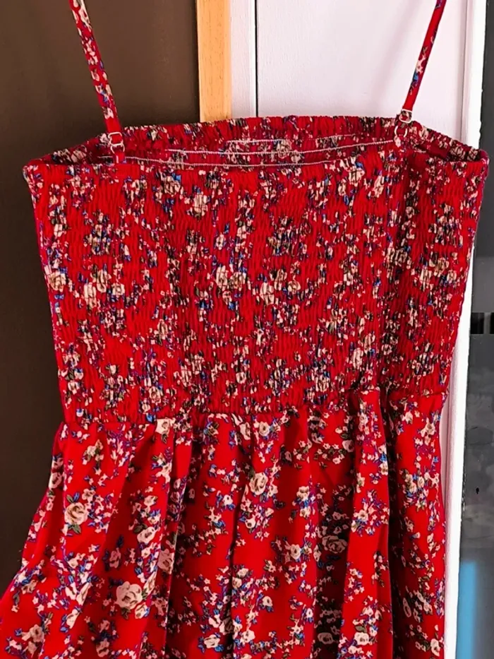 Robe mi longue fleurie rouge, bleue et blanche à bretelles femme XL