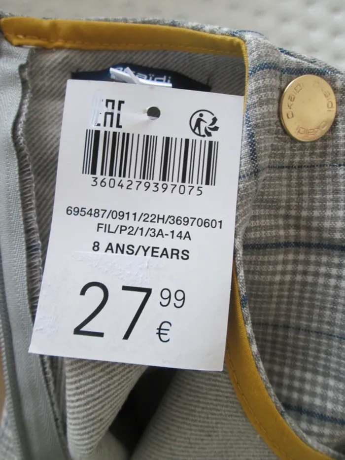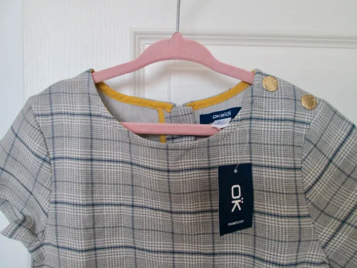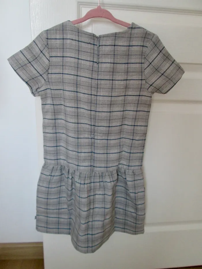 Robe habillé neuf avec étiquette marque Okaïdi taille 8 ans à carreaux grise avec liseret jaune moutarde Coupe droite sur le haut du corps et évasée sous la taille basse marquée. Encolure arrondie finition liseré. Manches courtes 64 % Polyester - 34 % Viscose - 2 % Elasthane
