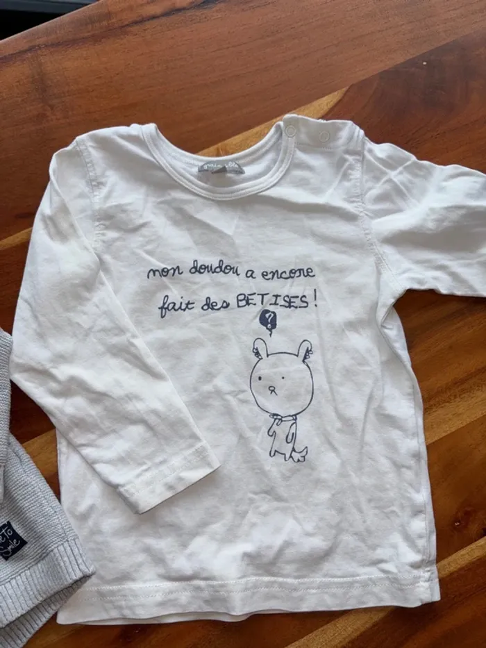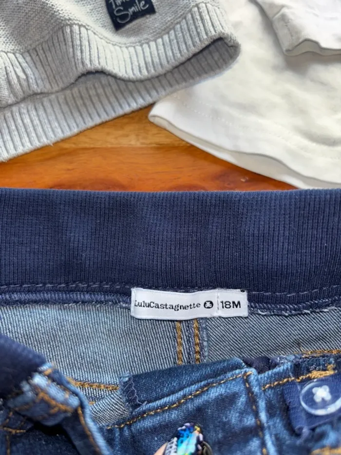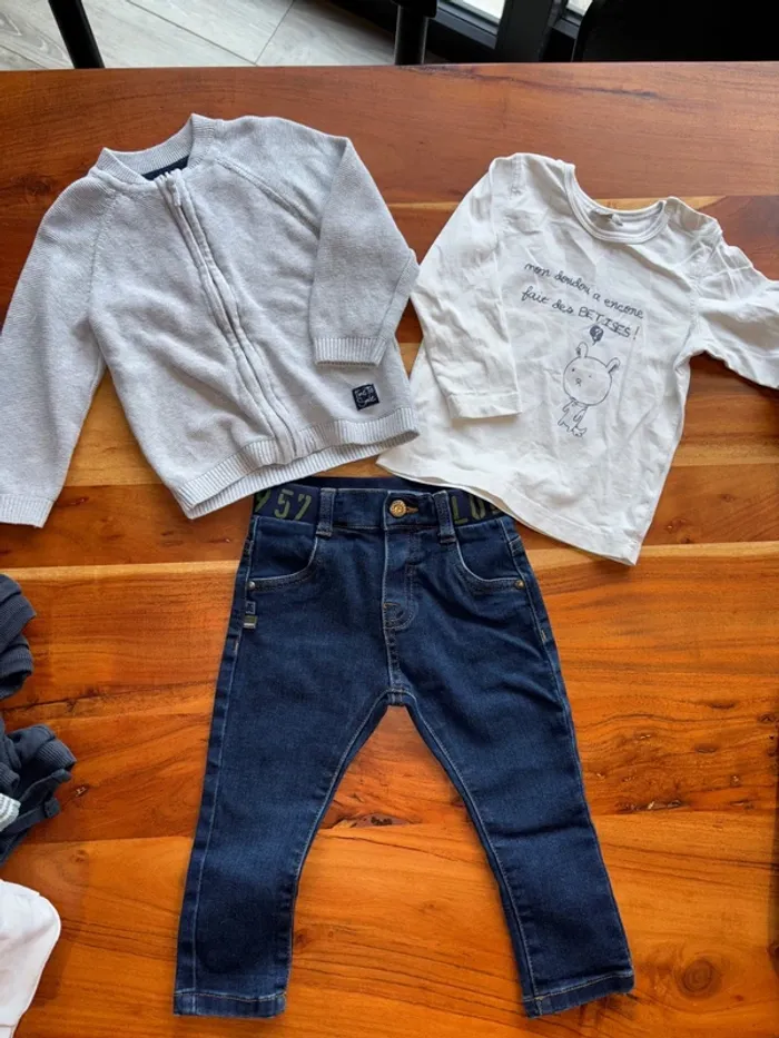 Je vend cet ensemble en taille 18 mois comportant un jean Lulu castagnette, un teeshirt ML et un gilet Gemo