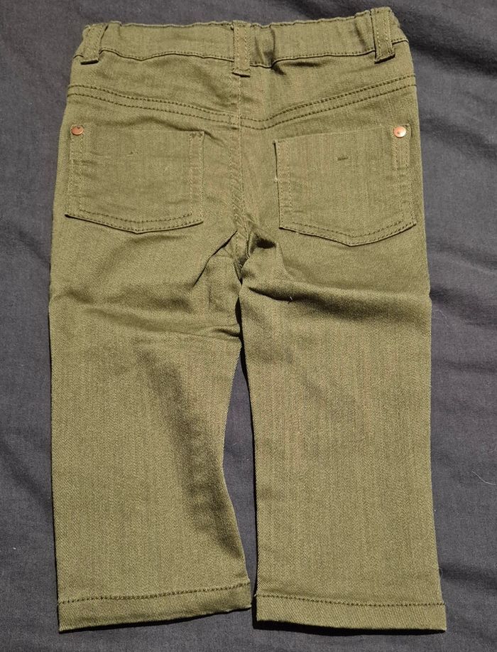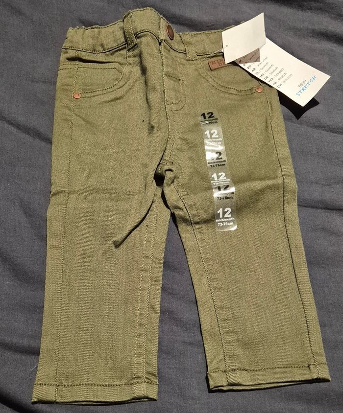 Pantalon type jean de taille 12 m/73-76 cm et de couleur kaki. Il se ferme avec un bouton pression. Il est neuf.