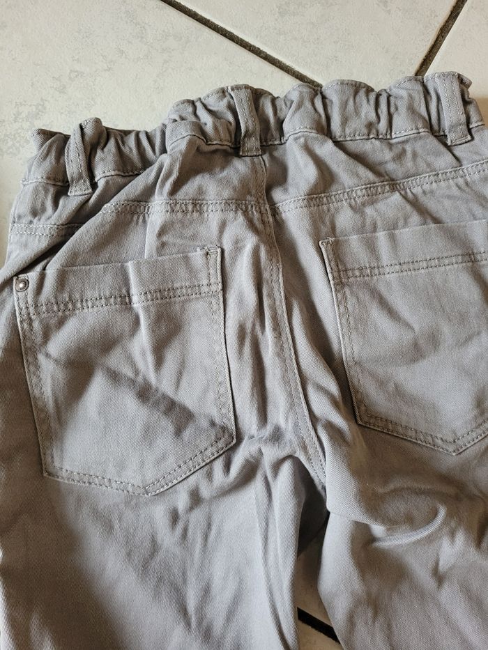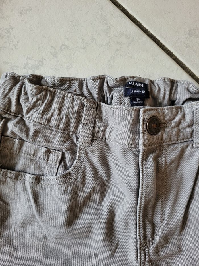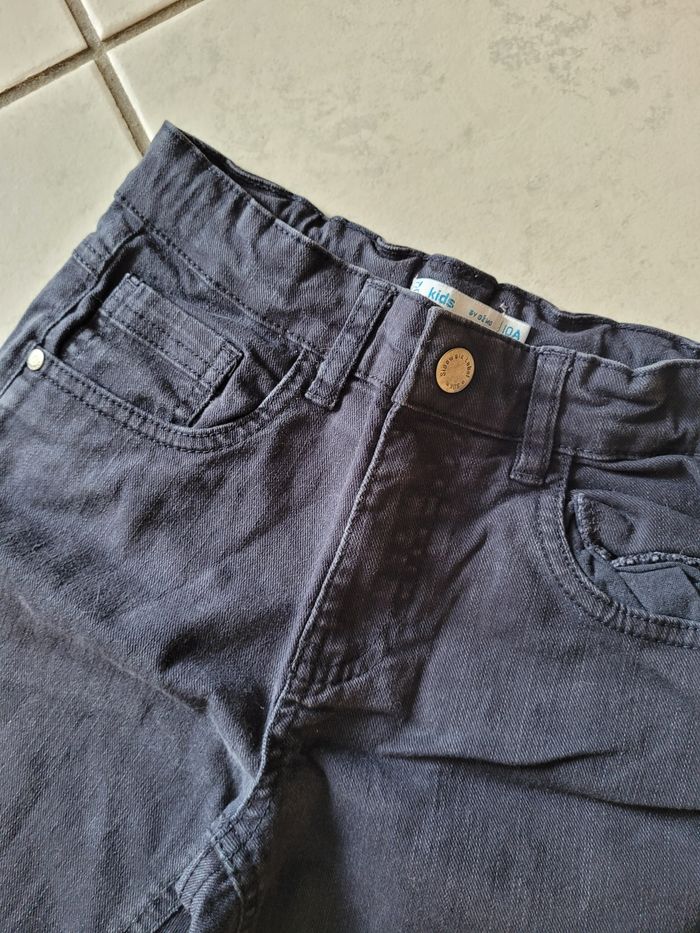 Taille 10 ans Le lot comprend : - 1 gris clair skinny fit Kiabi 98% coton 2% élasthanne Taille ajustable Très bon état - 1 bleu marine Gémo 98% coton 2% élasthanne Taille ajustable Bon état - 1 gris anthracite léger Kiabi 100% coton Taille ajustable Très bon état OFFERT 1 débardeur Star Wars ÉTAT SATISFAISANT
