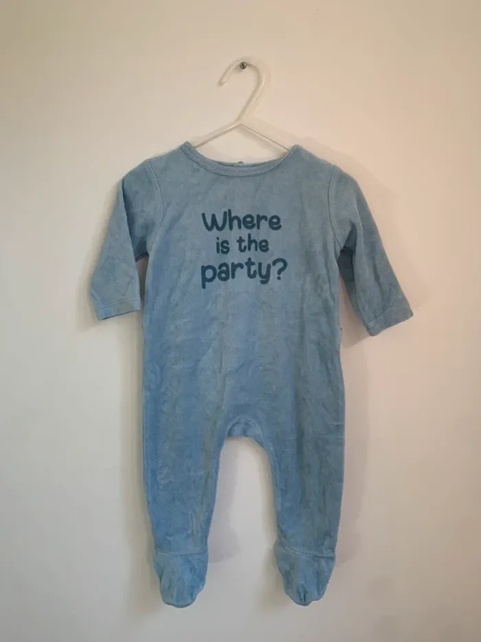 📏 Taille : 6 mois 🏷️ Marque : Tex Baby 🎨 Couleur : Bleu clair ✨ État : Très bon état 💬 Détails : • Pyjama en velours tout doux pour le confort de bébé 🤗 • Inscription amusante : “Where is the party?” 🎉 • Pieds intégrés pour garder bébé bien au chaud 🧦 • Pratique et facile à enfiler grâce à sa coupe adaptée 👶 #oussama1418_6mois
