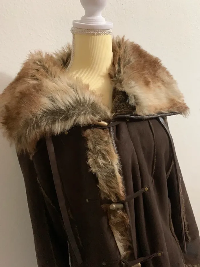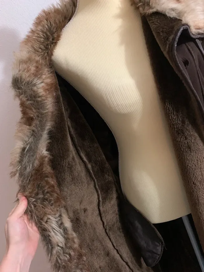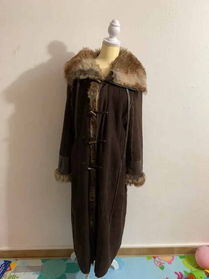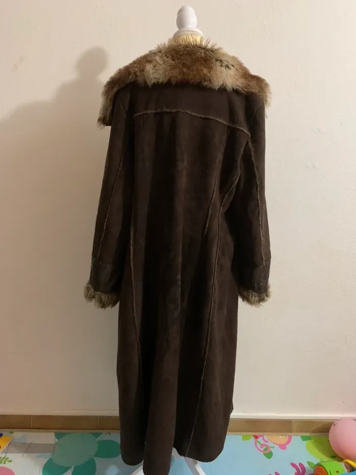 Manteau long marron en suédine avec fausse fourrure – Taille 46