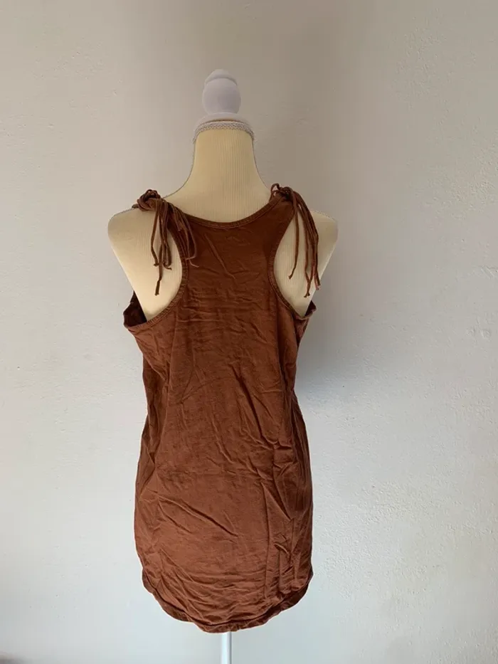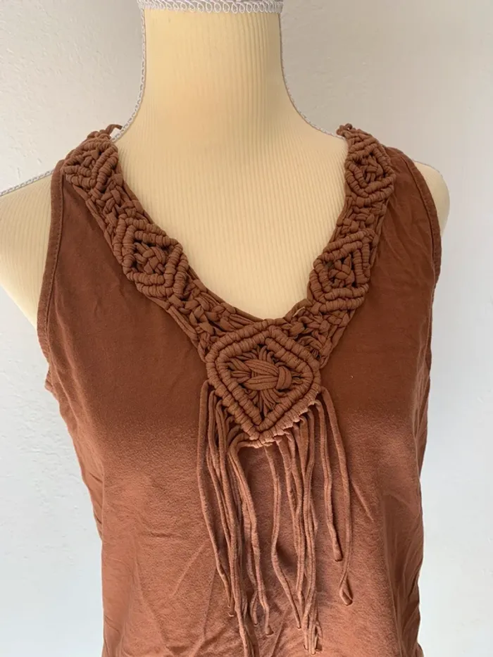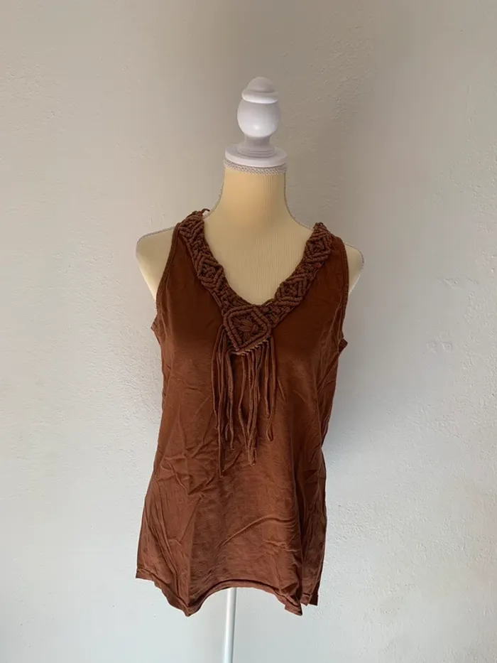 Débardeur marron bohème à détails macramé et franges – Taille M