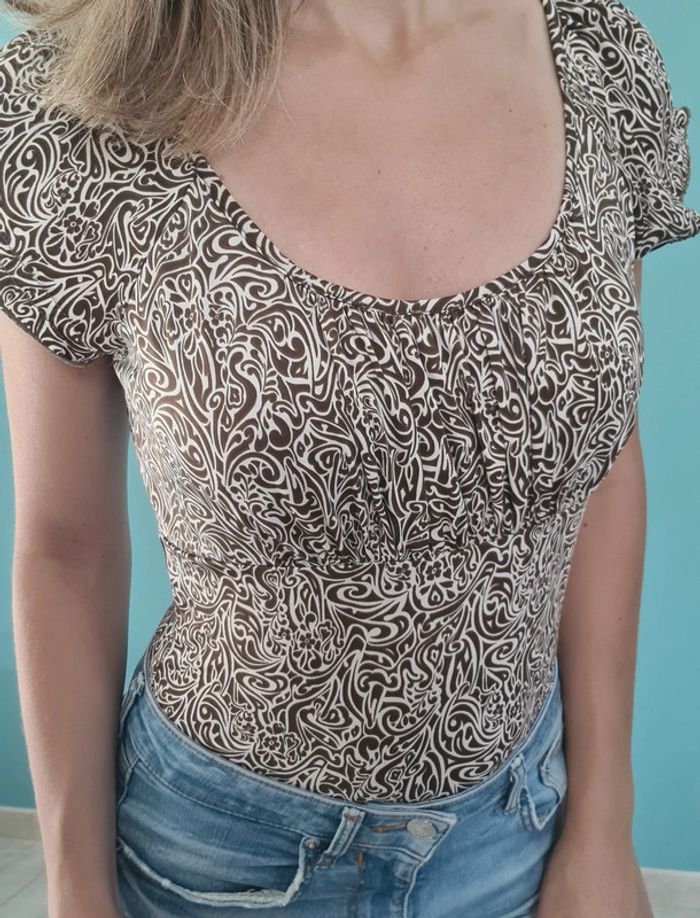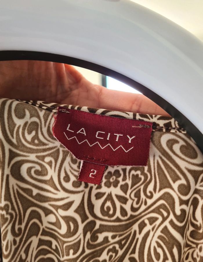 Tee-shirt col arrondi Léger effet plissé au niveau de la poitrine Marque La city Taille 2 Coloris marron et blanc Plus d'étiquette compo Excellent état