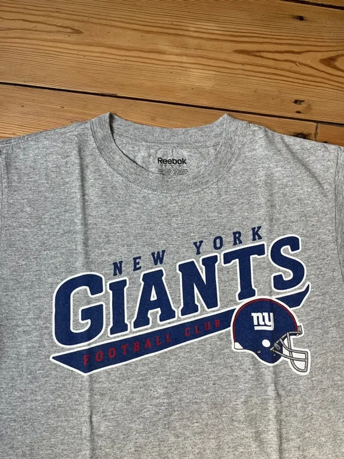 Très bon état Couleur gris chiné inscriptions bleu Club football américain Giants New York Taille S mais acheté à New York pour moi il correspond plus à du M