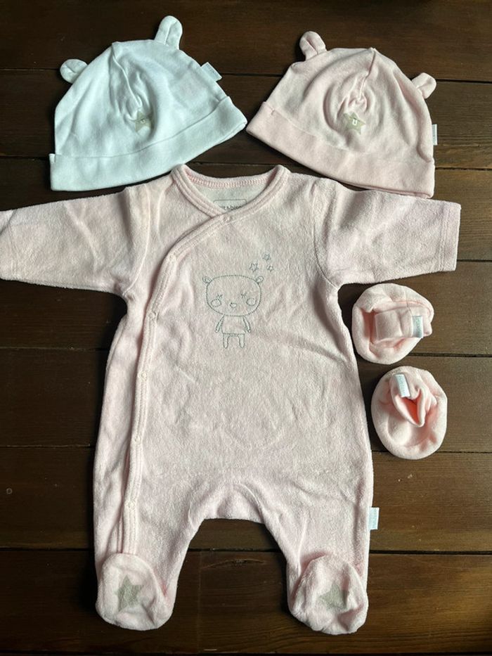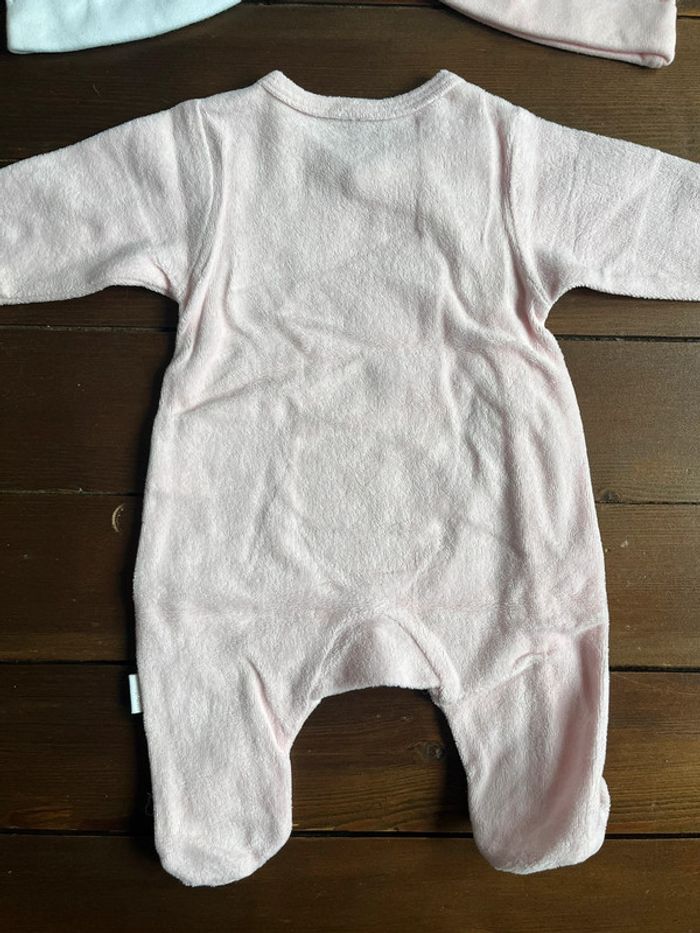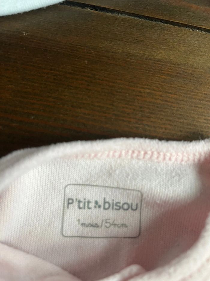 Taille 1 mois 54 cm Le tout en très bon état Couleur rose et blanc Marque P’tit bisou