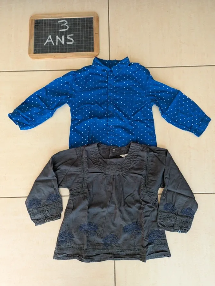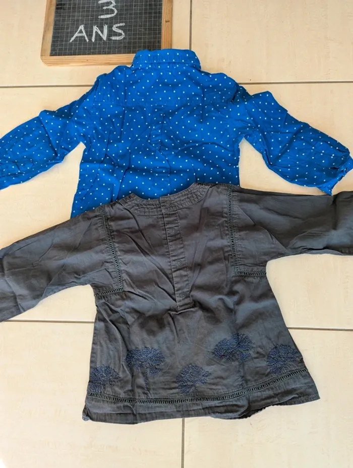 Très bon état -1 chemise manches longues bleue à pois blancs -1 blouses à manches longues grises kid kanai **Nombreux articles dans mon dressing de 3 ans. Je fais des réductions pour les lots* #nel1687_fille3ans