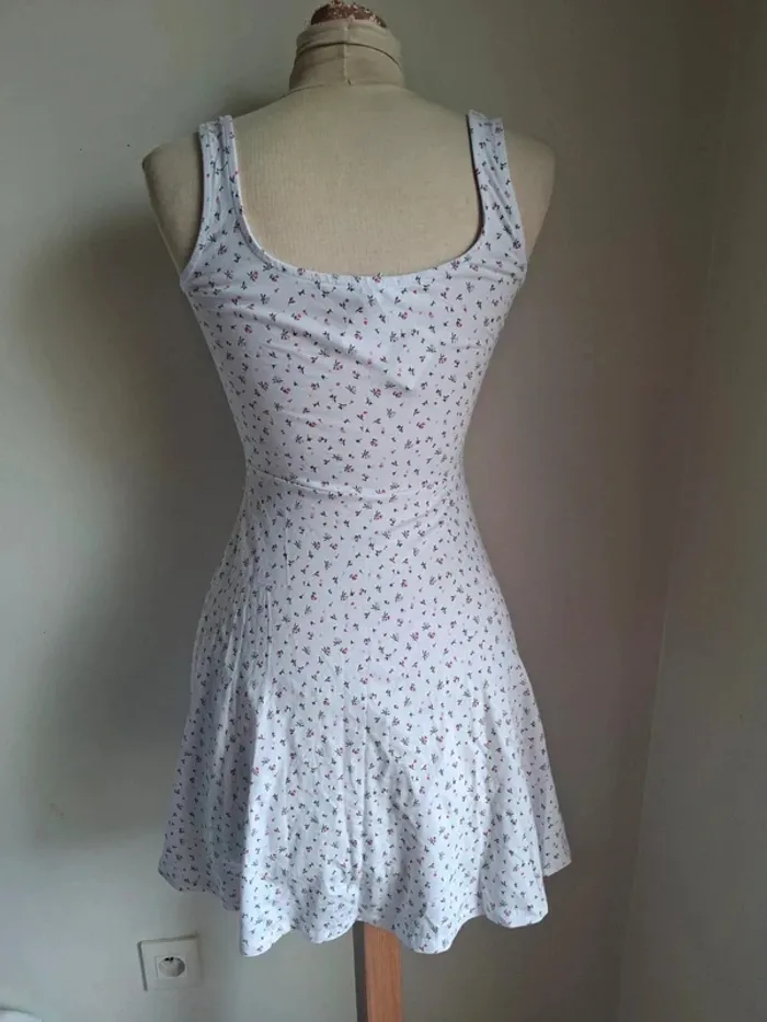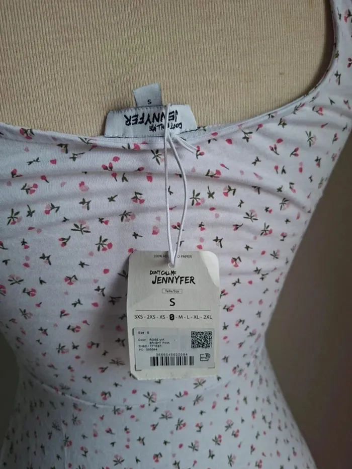 Robe Jennyfer, neuve, taille S **Matière :** 96% coton, 4% élasthanne **Dimensions :** - Aisselle à aisselle : 35 cm - Longueur : 86 cm #tailles_sofaia971 **Description :** Robe Jennyfer neuve avec étiquette, jamais portée. Tissu doux et confortable avec un joli motif floral. Idéale pour l'été ou une journée décontractée. **#robeJennyfer #tailleS #modefemme #robenouvelle #floral #coton #élastane**