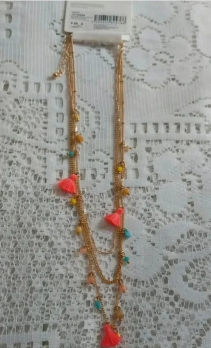 Magnifique collier fantaisie multi-rangs avec chaînes dorées. Parfaitement neuf, il est orné de petites perles colorées et de pompons rose vif pour une touche bohème et élégante. Idéal pour accessoiriser vos tenues d'été ou apporter une touche originale à vos looks quotidiens. N'attendez plus pour vous faire plaisir ! #collierfantaisie #bijouxfemme #accessoiremode #bijouxcolorés #bohème #neuf #collierdoré #pompons #été #style