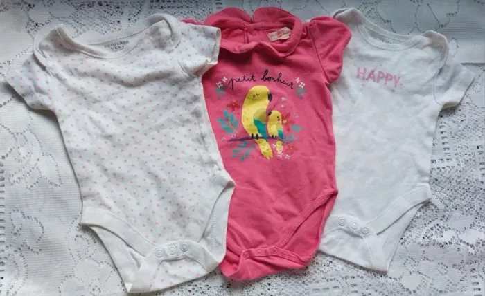 Je vous propose un lot de 3 bodys adorables et en très bon état, parfaits pour votre petite fille ! 🌸 - **Body 1** : Rose avec un motif coloré de perroquets et l'inscription "petit bonheur", idéal pour apporter une touche de gaieté. - **Body 2** : Blanc à petits pois roses, très doux et confortable. - **Body 3** : Blanc avec l'inscription "HAPPY", pour des journées pleines de sourires. Ces bodys sont de qualité, bien entretenus, et prêts à être portés. Ils conviennent parfaitement pour la saison actuelle ou comme cadeaux ! #taille3mois_sofaia971 #BébéFille #ModeBébé #3Mois #BodyBébé #VêtementsFille #LotVêtements