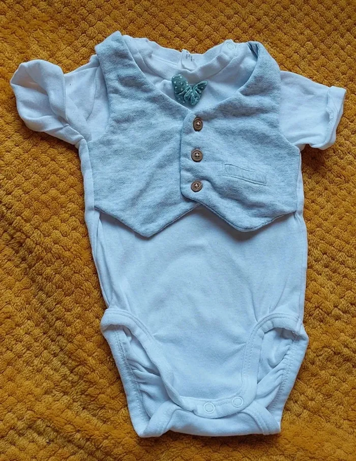 Adorable body H&M pour bébé, taille 2/4 mois. En très bon état général, avec un design chic incluant un petit nœud papillon et un gilet intégré. Idéal pour une occasion spéciale ou une sortie élégante. ⚠️ À noter : deux petites tâches discrètes en bas du body (voir dernière photo). Prix attractif, ne ratez pas cette occasion ! #taille2mois_sofaia971 #HM #bodybébé #2mois #4mois #vêtementbébé #chic