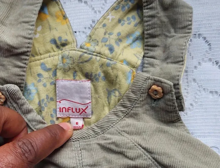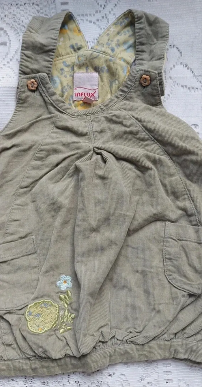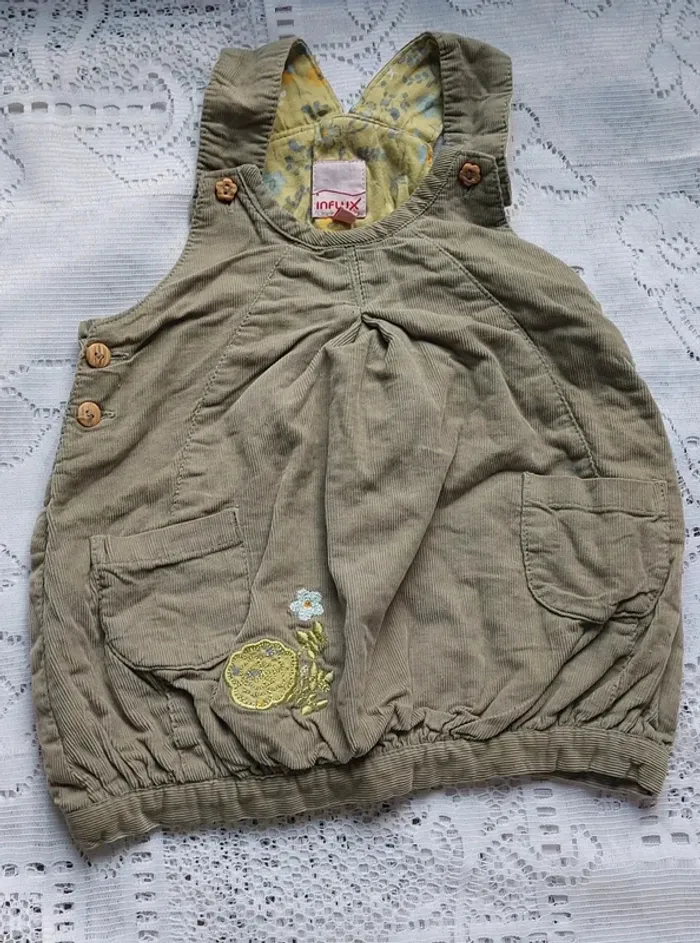 Craquez pour cette adorable salopette Influx, parfaite pour votre petit bout de chou de 6 mois. Elle est en très bon état, avec un joli tissu côtelé kaki et une doublure intérieure à motifs floraux. Les détails brodés ajoutent une touche de charme à cette pièce confortable et pratique, idéale pour les journées d'été comme pour les balades en automne. Elle se ferme facilement grâce aux boutons sur les côtés. Ne manquez pas cette occasion ! #taille6mois_sofaia971 #SalopetteBébé #Influx #6Mois #VêtementsBébé #ModeBébé #VintedFrance #Enfant #BébéFille #BébéGarçon