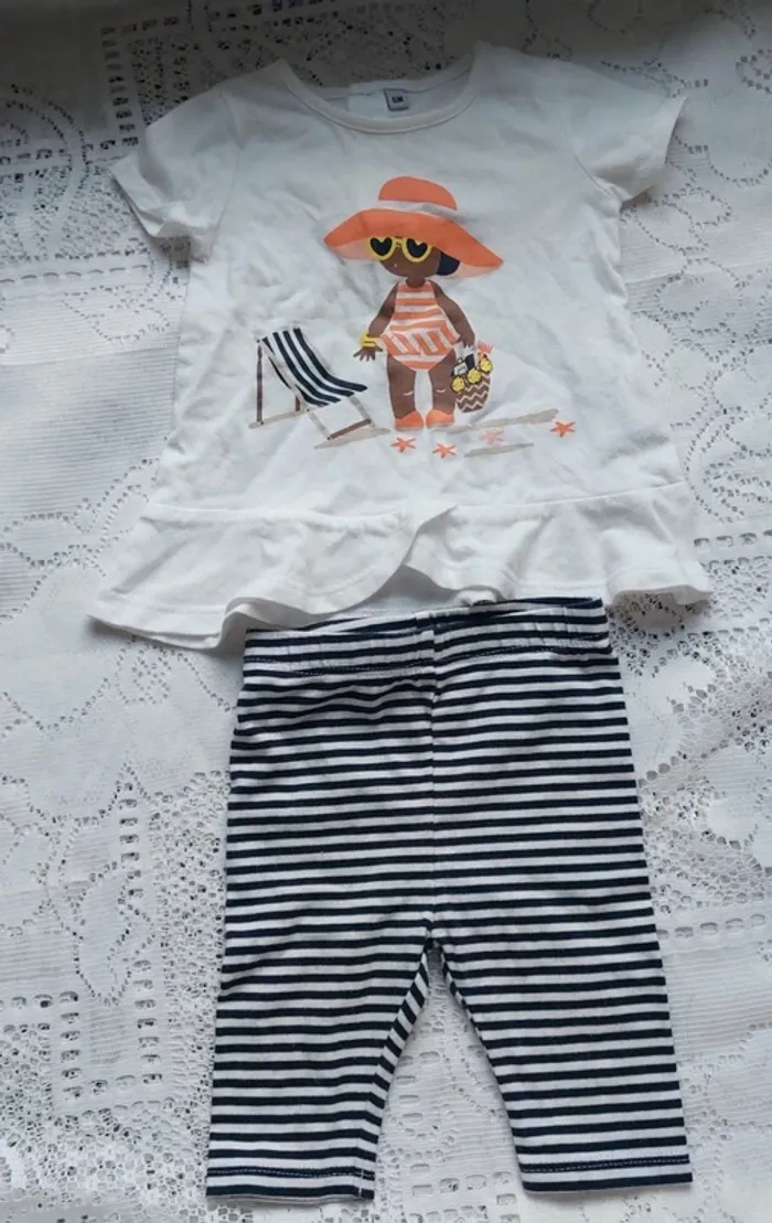 Charmant ensemble pour bébé, taille 6 mois, comprenant un haut avec un joli motif estival et un bas à rayures. L'ensemble est en très bon état, parfait pour les journées ensoleillées ! 📌 *Note*: Une petite tâche est présente sur le haut, mais elle reste discrète (voir dernière photo). Idéal pour offrir un look tendance et confortable à votre petit bout. #taille6mois_sofaia971 #EnsembleBébé #ModeBébé #VêtementsBébé #6Mois #TendanceBébé #BonÉtat #VenteVinted